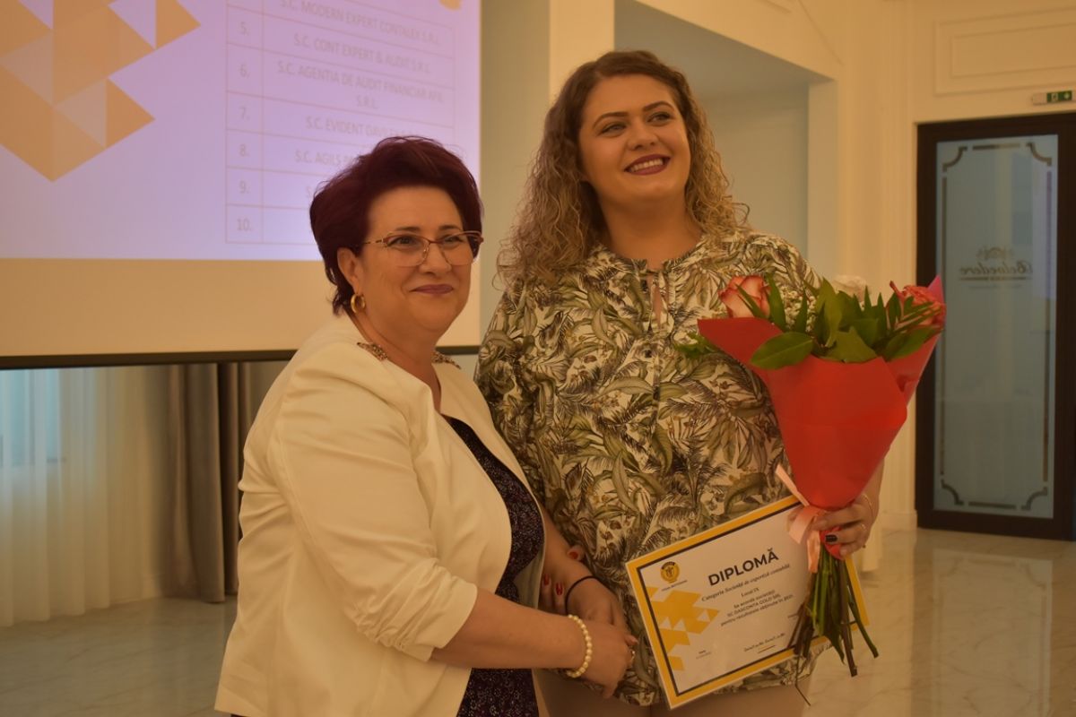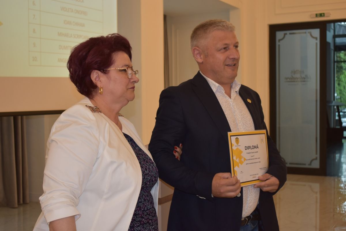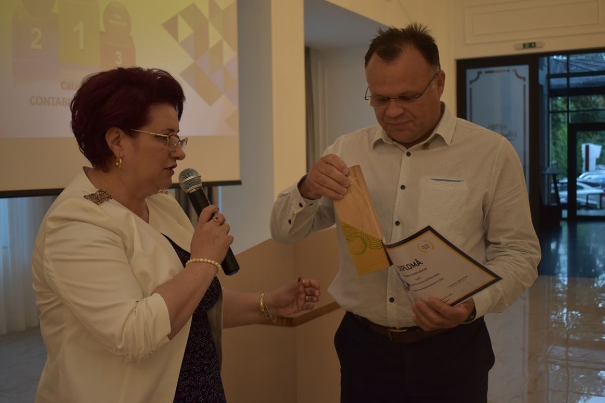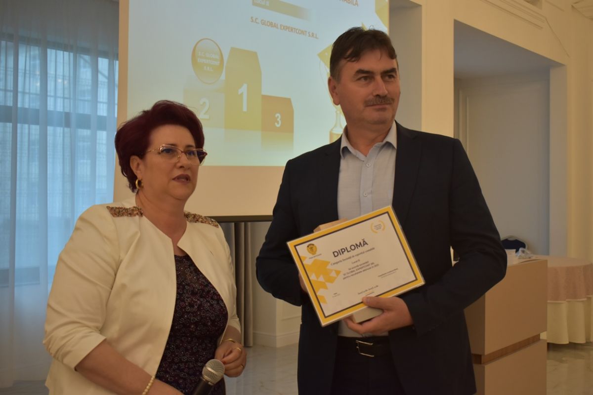 Cum a fost amfitrionul manifestării, în momentele multiplei premieri, în fața asistenței a venit expertul contabil Mihai Olteanu pentru a-i înmâna diploma ori angajate de la cele două firme pentru a primi distincțiile.