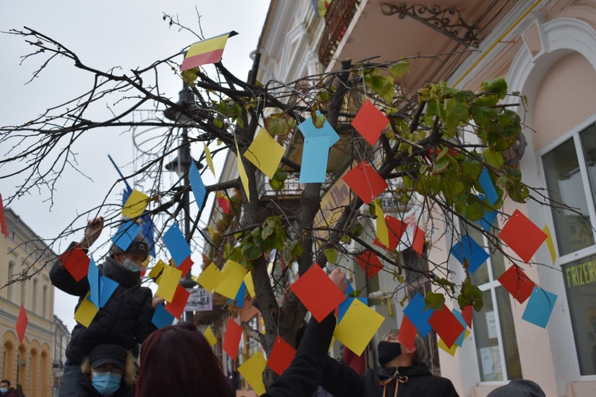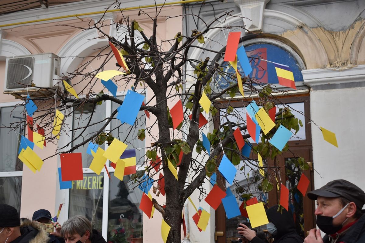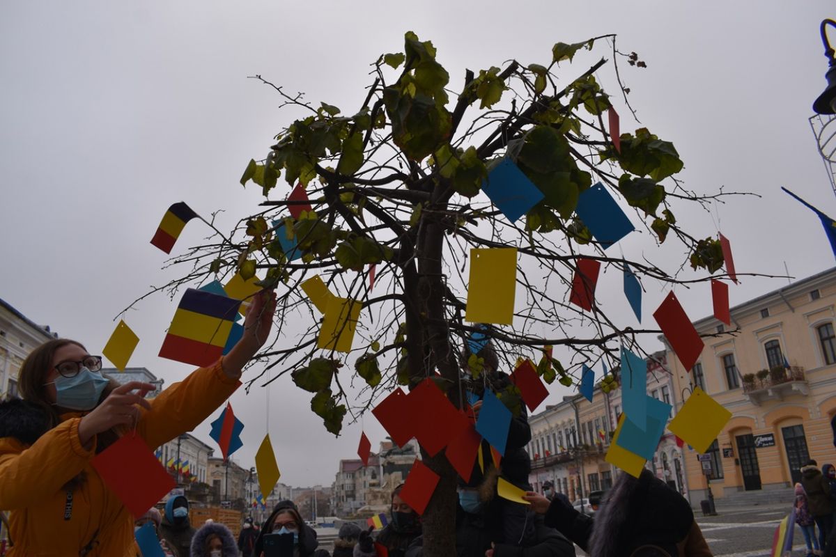 În jur de 25 de copii s-a strâns în jurul orei 10:00 lângă Biserica Uspenia, iar apoi s-au deplasat în Piața 1 Decembrie 1918, unde au îmbrăcat un copac în straie tricolore.