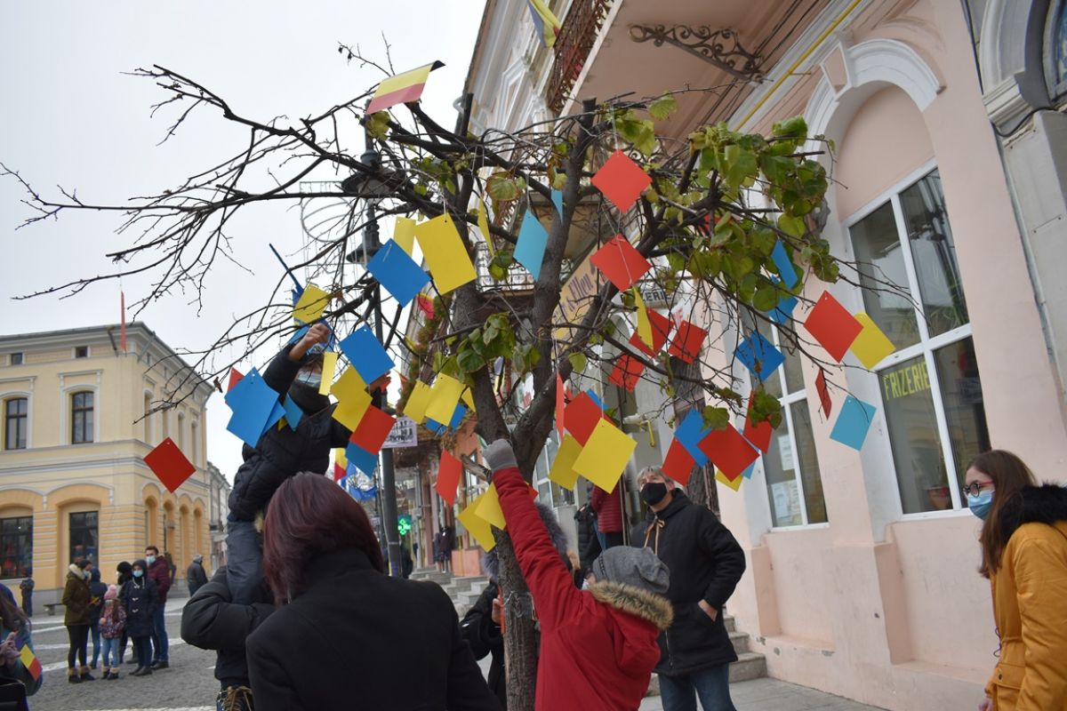 Elevii au venit cu zeci de cartonașe colorate în roșu, galben și albastru pe care le-au agățat în arbore, realizând astfel ”Copacul Tricolorului Românesc”.