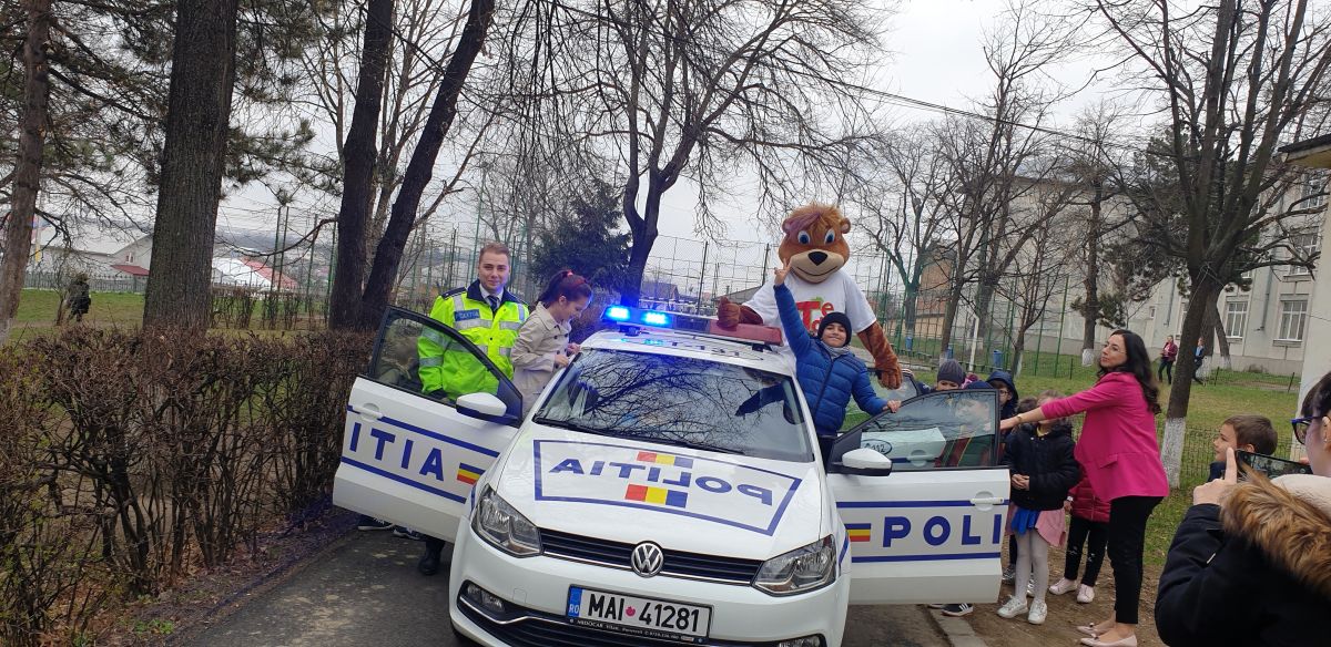 Copiii au fost încântați să se afle la volanul unei mașini de poliție, să poarte șapca de polițist rutier, precum și să primească autografe de la Ursulețul Tedi.