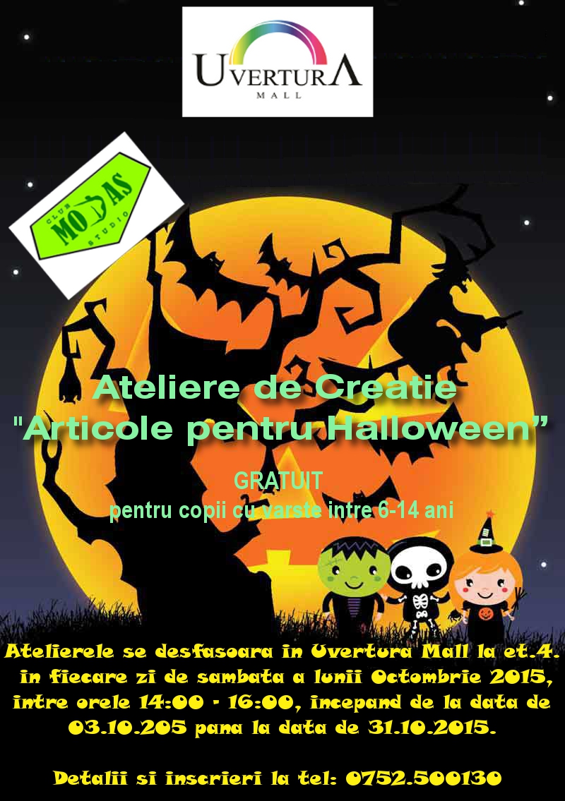 Uvertura Mall Botoșani în parteneriat cu Club “Modas Studio” organizează în luna octombrie Ateliere de creație și distracție, gratuite pentru toți copiii cu vârste între 6 -14 ani. În fiecare sâmbătă a lunii octombrie, între orele 14:00 -16:00 copiii sunt așteptați în Uvertura Mall, la etajul 4, unde vor învăța și vor crea accesorii și articole pentru ziua de Halloween.