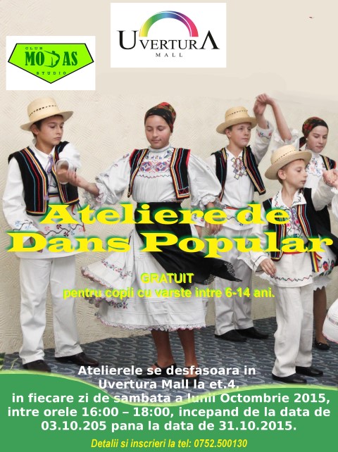 Iar între orele 16:00 -18:00 tot la etajul 4, copii vor putea participa gratuit la atelierele de Dans Popular, unde moderatorii Club “Modas Studio” îi vor îndruma să facă primii pași în arta dansului popular românesc.