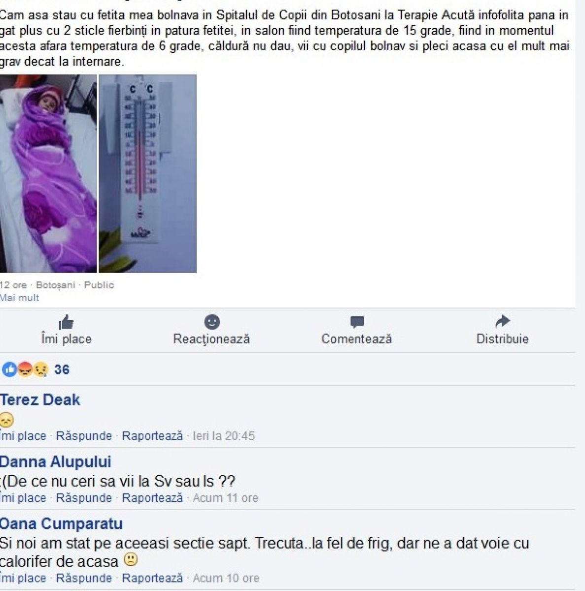 ”Cam asa stau cu fetita mea bolnava in Spitalul de Copii din Botosani la Terapie Acută infofolita pana in gat plus cu 2 sticle fierbinți in patura fetitei, in salon fiind temperatura de 15 grade, fiind in momentul acesta afara temperatura de 6 grade, căldură nu dau, vii cu copilul bolnav si pleci acasa cu el mult mai grav decat la internare”, a scris pe rețeaua de socializare respectiva mămică.