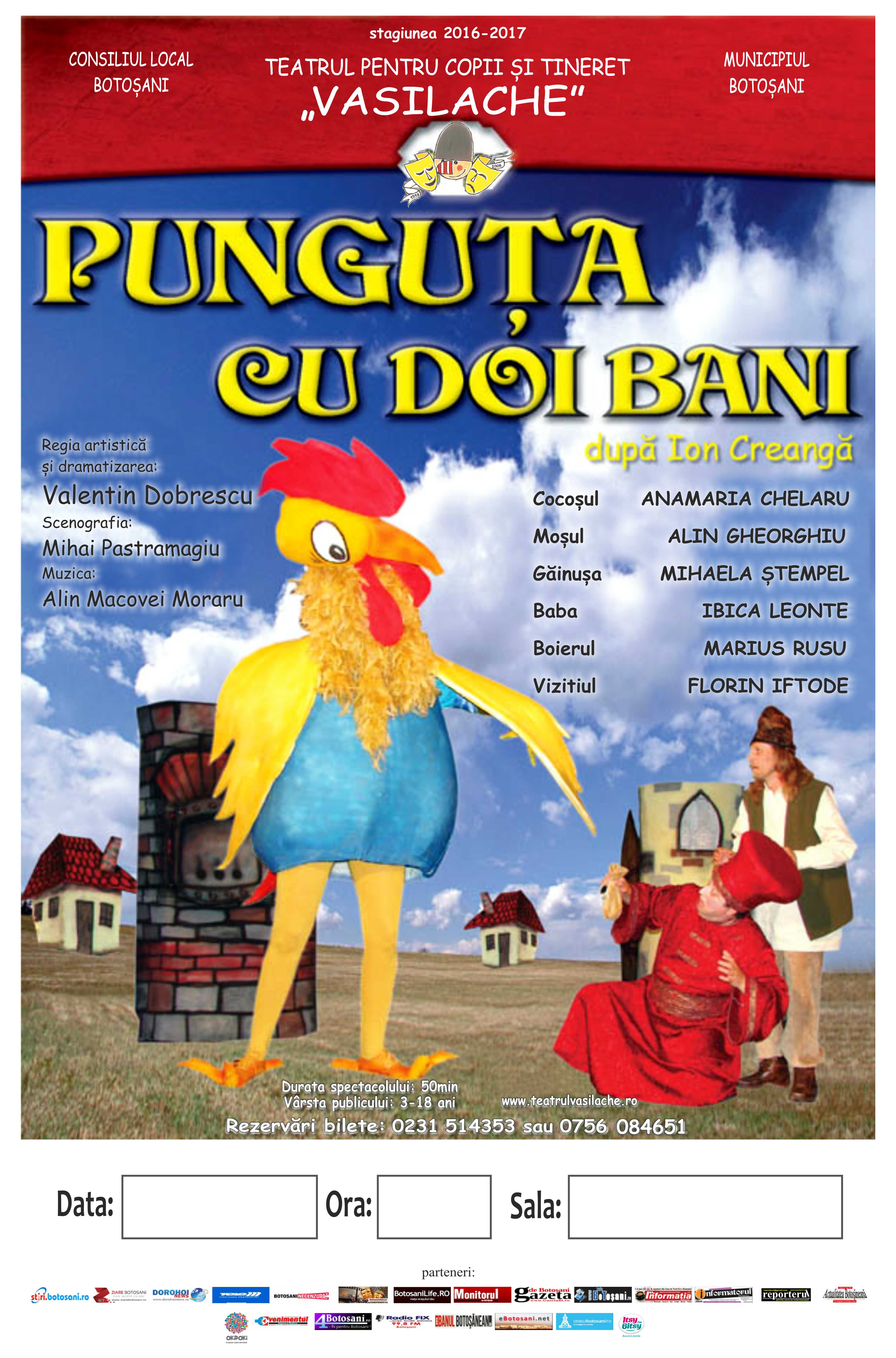 Reprezentanții instituției de cultură aflată în subordinea Primăriei Botoșani invită copiii în această săptămână la Teatrul „Vasilache" să vizioneze spectacolul „Punguța cu doi bani".