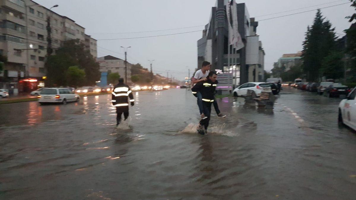Străzile sunt inundate, iar mașinile înaintează cu greu, pentru a ajunge la domicilii. Calea Națională este blocată de ape, iar în zona Stadionului Municipal pompierii au fost nevoiți să scoată dintr-un autoturism un băiat care suferise un atac de panică, după ce a rămas blocat în mașină.