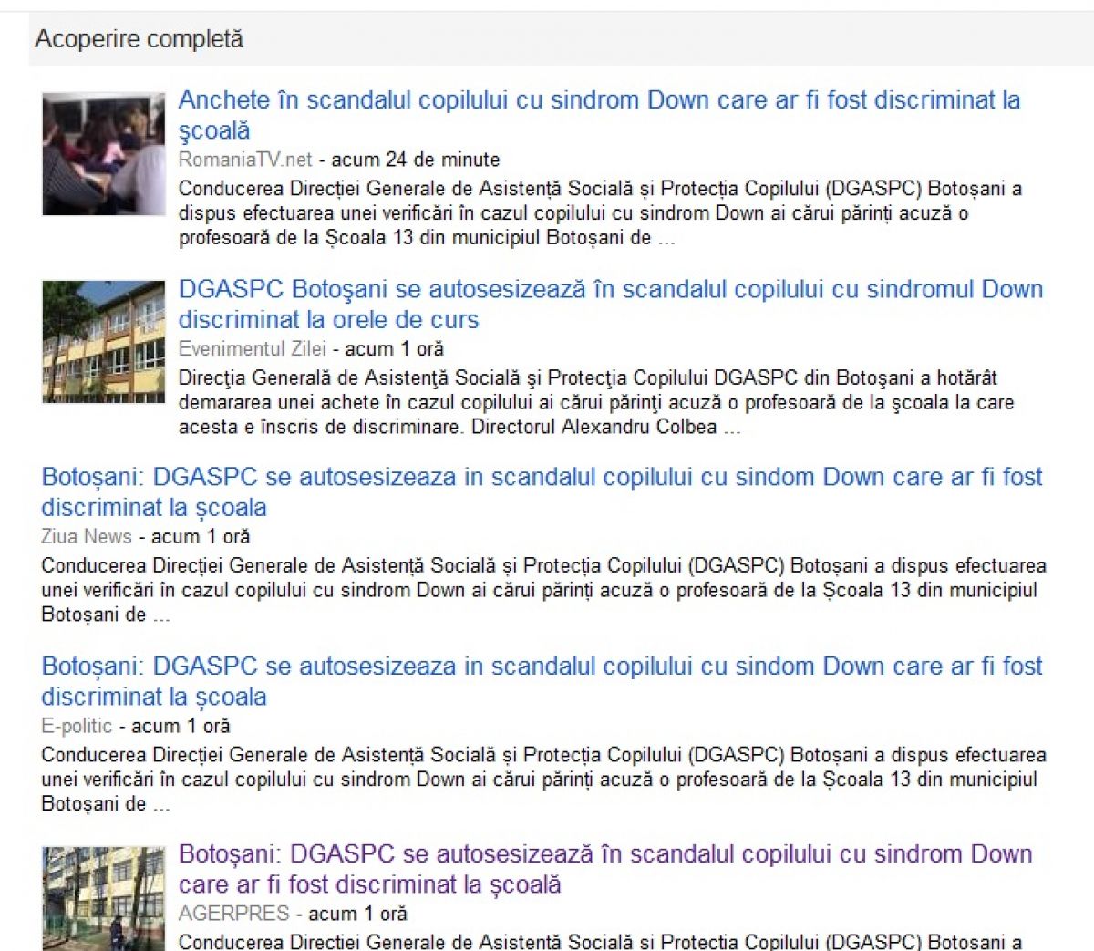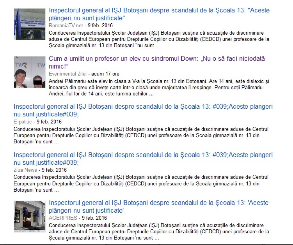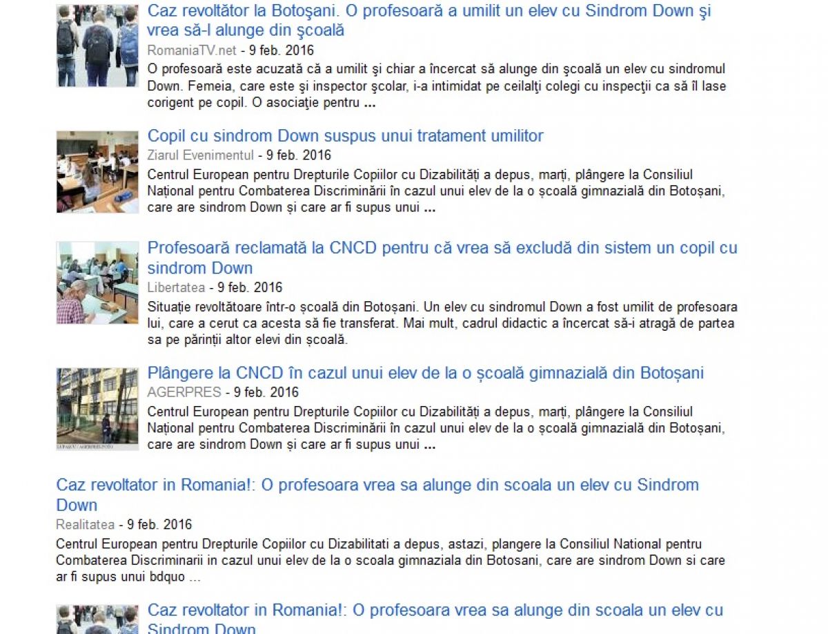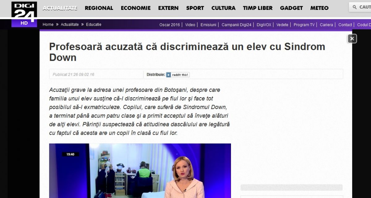 După ce în mediul virtual a fost publicat ieri, 9 februarie 2016, comunicatul de presă ce anunța că a fost depusă o plângere la Consiliul Național pentru Combaterea Discriminării, față de profesoara din Botoșani, mass-media din întreaga țară a preluat cazul revoltător al minorului. Chiar dacă profesoara neagă toate acuzațiile ce îi sunt aduse de părinții elevului, situația lui Andrei a făcut înconjurul țării. De pildă, reporterii Digi24 au scris ”acuzaţii grave la adresa unei profesoare din Botoşani, despre care familia unui elev susţine că-l discriminează pe fiul lor şi face tot posibilul să-l exmatriculeze. Copilul, care suferă de Sindromul Down, a terminat până acum patru clase şi a primit acceptul să înveţe alături de alţi elevi. Părinţii suspectează că atitudinea dascălului are legătură cu faptul că acesta are un copil în clasă cu fiul lor”. De altfel, scandalul a ajuns și la urechile trustului Pro TV, Andreea Esca începând buletinul de știri cu incidentul de la Botoșani. Ziarele naționale cum ar fi Evenimentul Zilei,România Liberă, Bună Ziua Iași au mediatizat subiectul.