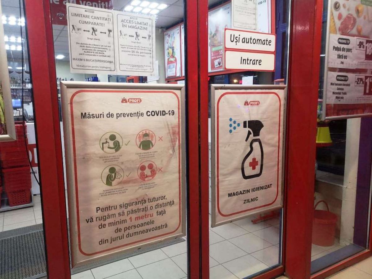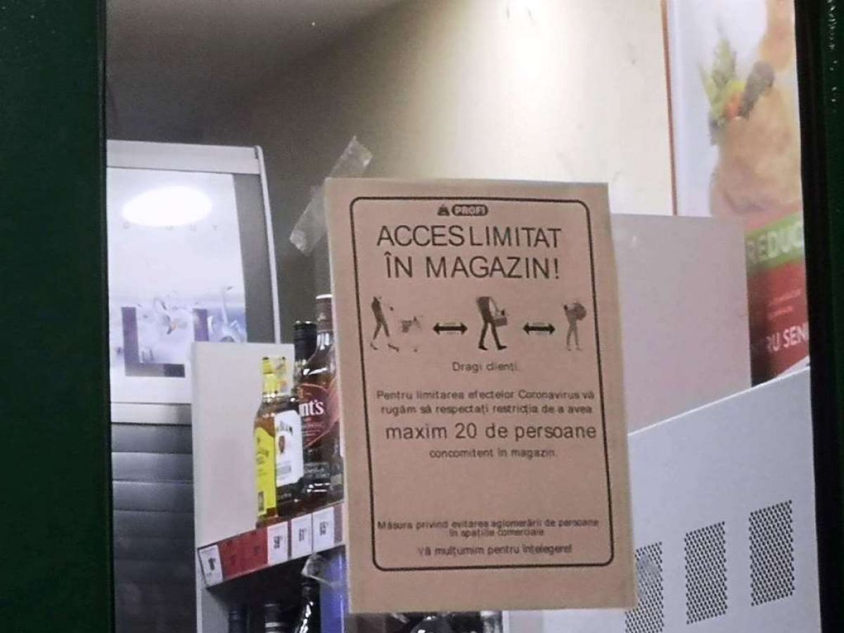 ”Pentru limitarea efectelor Coronavirus vă rugăm să respectați restricția de a avea maxim 20 de persoane concomitent în magazin”.