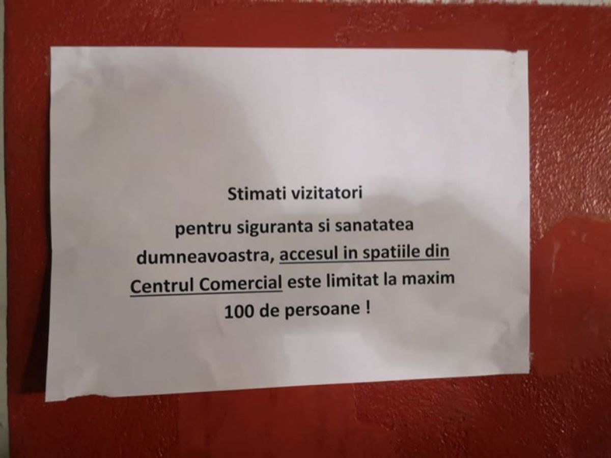 ”Stimați vizitatori, pentru siguranța și sănătatea dumneavoastră, accesul în spațiile din Centrul Comercial este limitat la maxim 100 de persoane”.