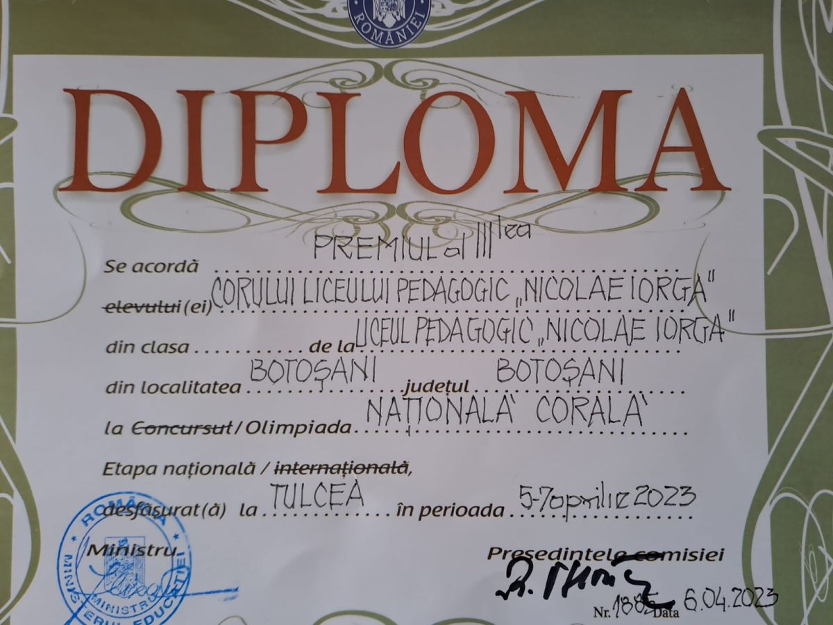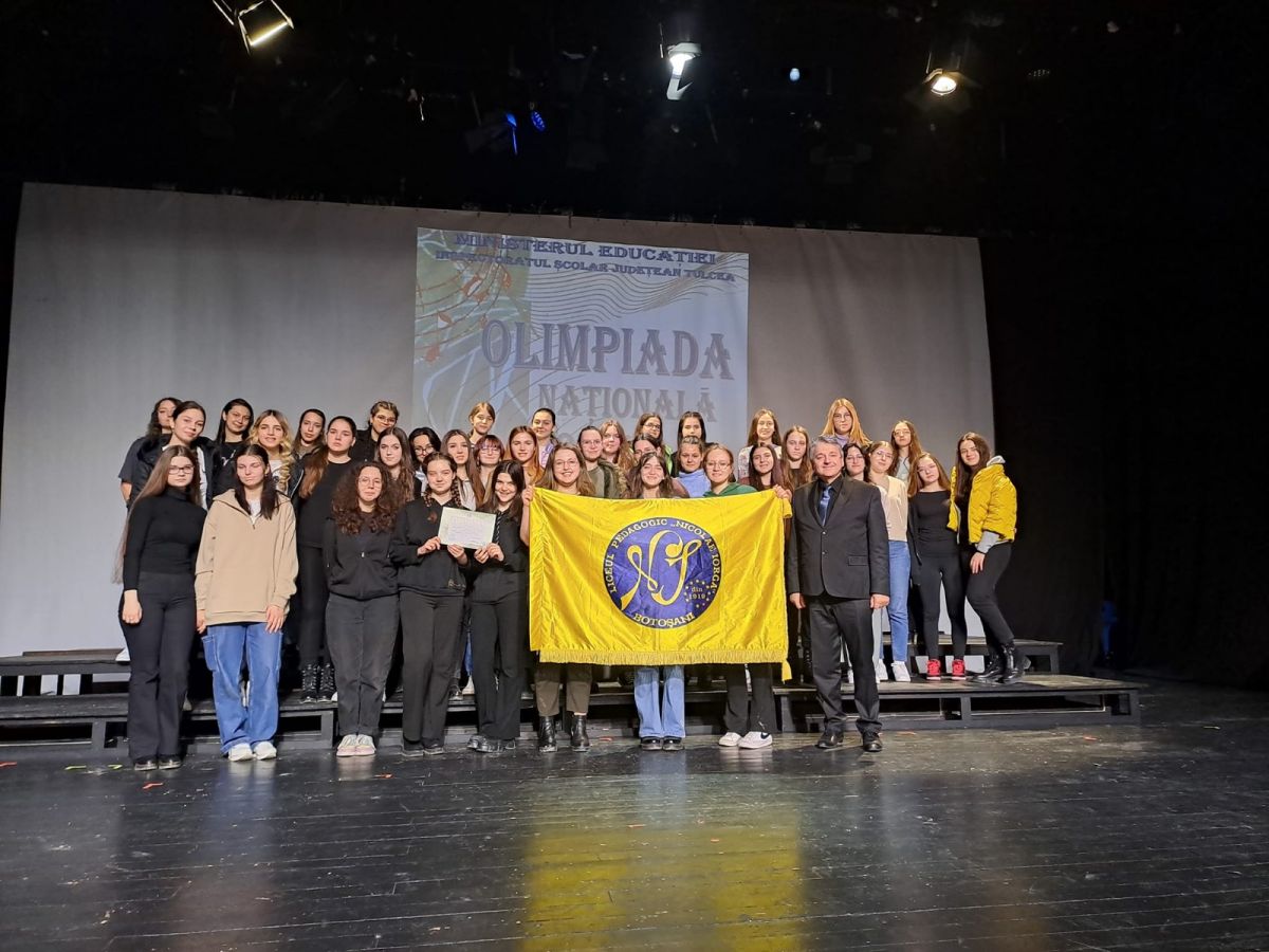 La etapa națională a Olimpiadei Naționale Corale, care s-a desfășurat la Tulcea, în perioada 5-7 aprilie 2023, cele 41 de eleve coordonate de domnul profesor dr. Palade Laurențiu de la Liceul Pedagogic ,,Nicolae Iorga” Botoșani, au obținut premiul al III-lea.