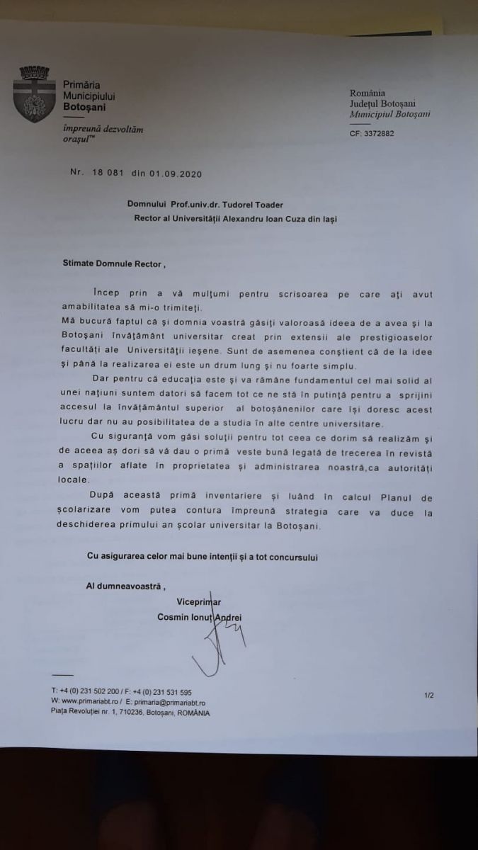 „Marți, pe 1 septembrie am trimis o adresă oficială domului rector al Universității Alexandru Ioan Cuza din Iași pentru a-l asigura de disponibilitatea mea și a colegilor pentru începerea procedurilor logistice cu privire la identificarea și stabilirea unor spații dedicate facultăților care urmează să se înființeze ca extensie a celor de la Iași din domeniul informaticii, economiei și științelor umaniste. Am început să mă ocup de inventarierea clădirilor din subordinea primăriei, astfel încât în cel mai scurt timp să trecem la etapa de acreditare a programelor de studii și de invitarea conducerii Universității Cuza, aici la Botoșani pentru prima vizită de lucru”,