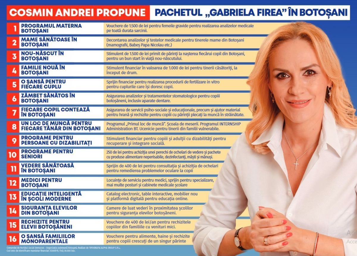 „Domnul Flutur ne tot vorbește despre ce a făcut și nu se vede nimic, dar nu spune despre ce nu a făcut, deși a promis multe, cum ar fi restaurarea Teatrului Mihai Eminescu, asfaltarea străzilor de la periferie sau investiții în școli și spitale. Eu vorbesc despre proiectele pe care botoșănenii mi-au spus că și le doresc. De aceea îl provoc pe domnul Flutur să ne spună dacă va susține, ca primar sau ca simplu consilier implementarea la Botoșani a Pachetului social „Gabriela Firea", a declarat Cosmin Andrei în postarea publică din mediul online adresată primarului Flutur.