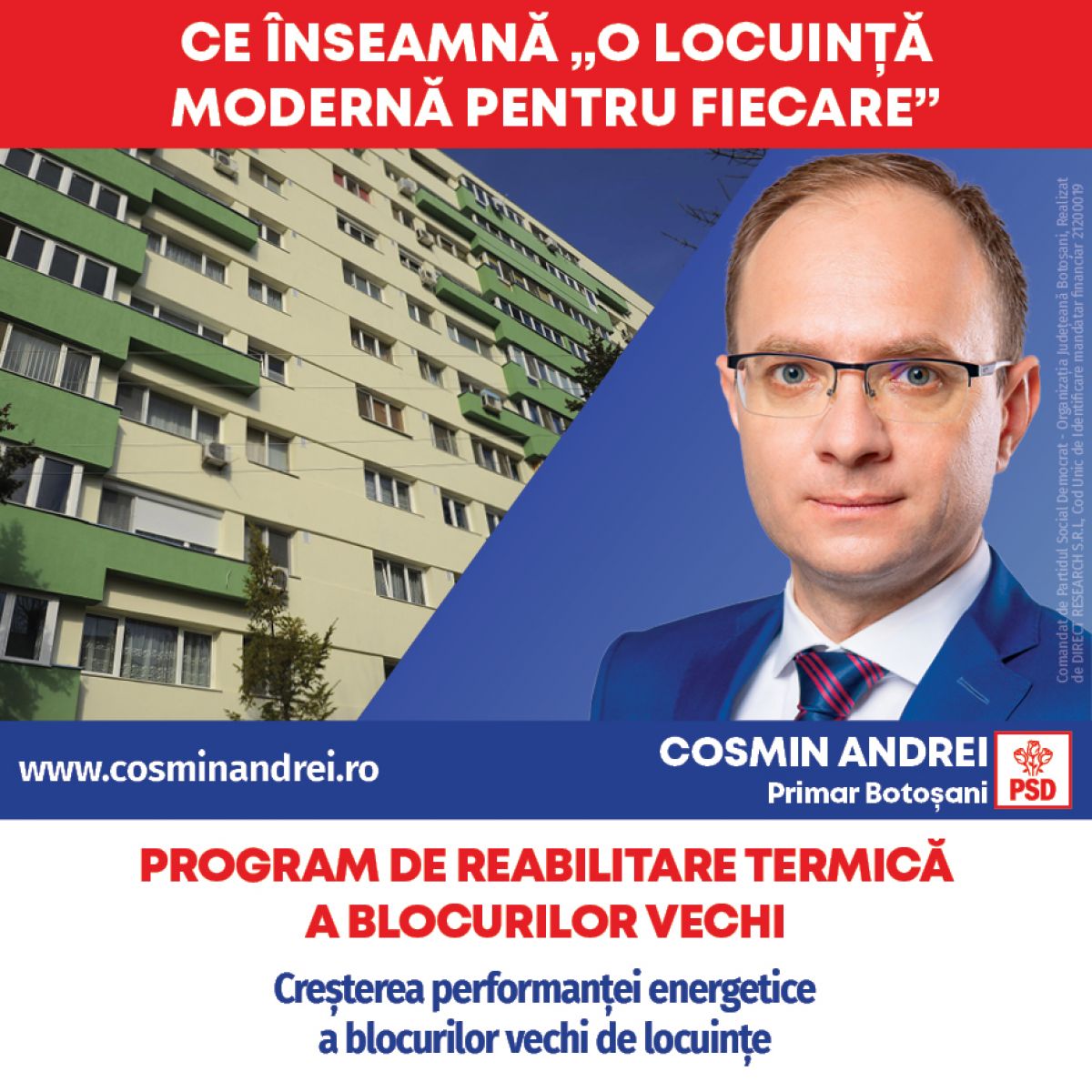 „Tinerii trebuie să aibă o perspectivă care să îi motiveze să rămână în oraș și să-și întemeieze o familie în Botoșani. De aceea, pe lângă programele de stimulare pentru crearea de locuri de muncă bine plătite, voi continua construcția blocurilor de locuințe ANL și a apartamentelor sociale începute în Guvernarea PSD. În paralel voi accesa fondurile europene pentru izolarea termică a blocurilor vechi, care nu au fost deloc utilizate de actualul primar, care nu a fost nicio secundă interesat de îmbunătățirea condițiilor de locuit ale botoșănenilor din cartierele orașului nostru”, a declarat Cosmin Andrei.