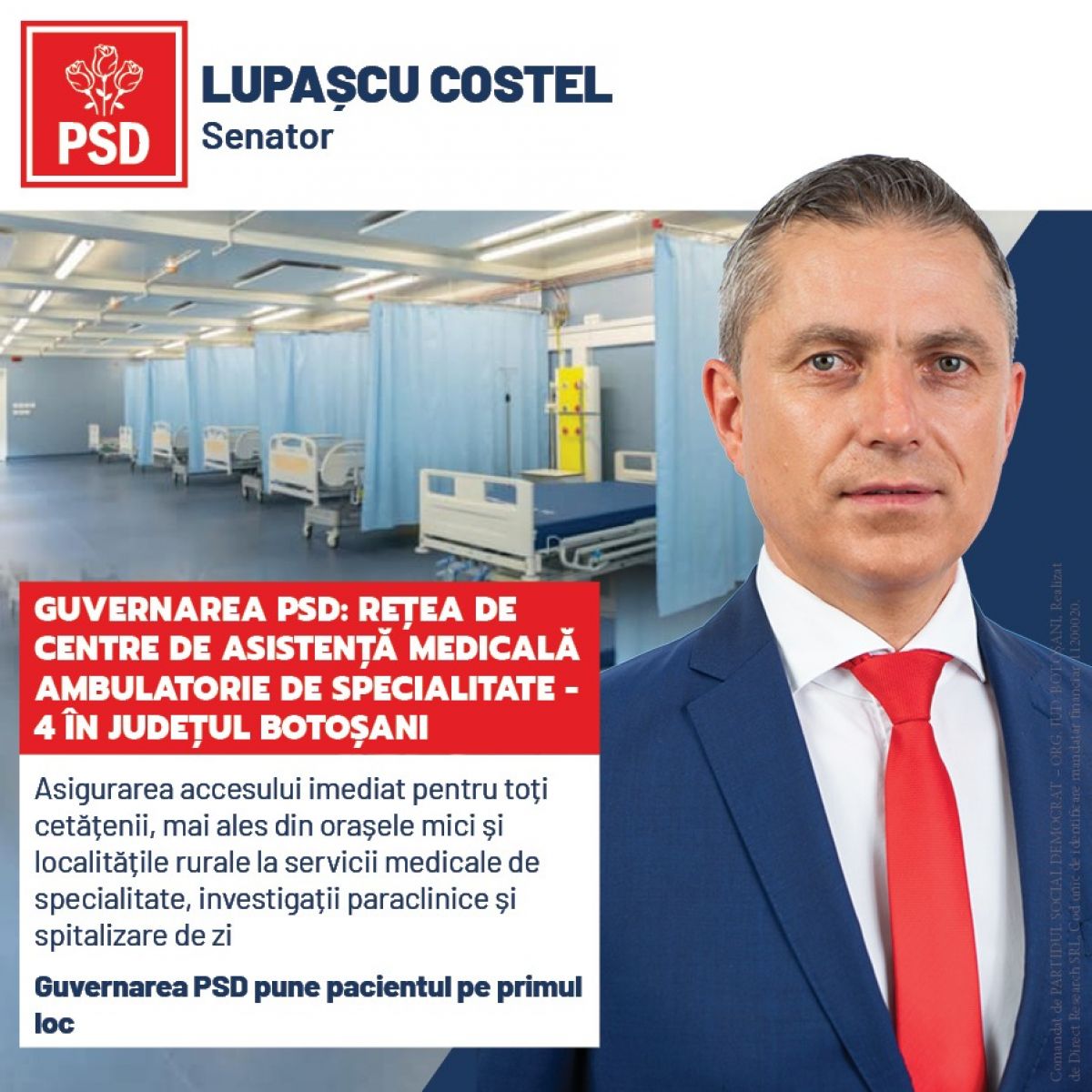 Deputatul social-democrat botoșănean, Costel Lupașcu, candidat pentru un mandat de senator a declarat astăzi că PSD a cuprins în programul de guvernare soluții concrete pentru asigurarea accesului imediat al tuturor cetățenilor, mai ales din orașele mici și din localitățile rurale la servicii medicale de specialitate, investigații paraclinice și spitalizare de zi.