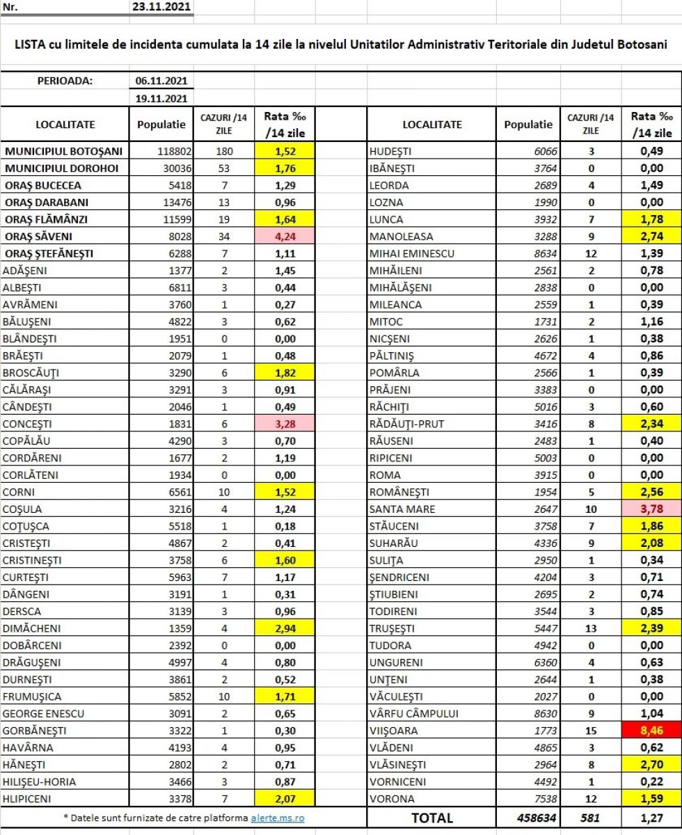 Patru localități sunt în scenariul roșu (Săveni – 4,24, Concești – 3,28, Santa Mare – 3,78), una dintre cele patru fiind cu rata de incidență peste 6 (Viișoara – 8,46, în creștere față de 23 noiembrie – 7,33).
