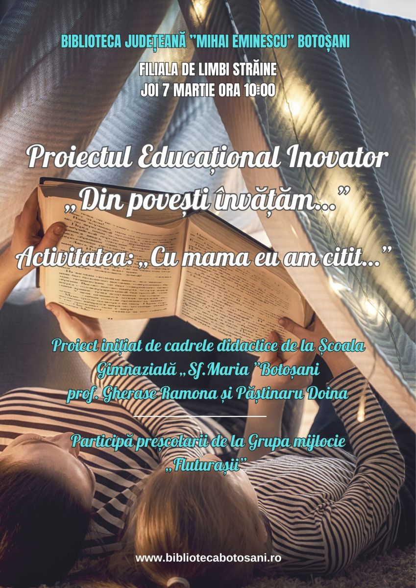 În cadrul Proiectului Educațional Inovator „Din povești învățăm….” inițiat de cadrele didactice de la Școala Gimnazială „Sf.Maria ”Botoșani, prof. Gherase Ramona și Păștinaru Doina, pe data de 7 martie 2024, preșcolarii de la Grupa mijlocie „Fluturașii” împreună cu mamele și bunicile, vor participa la activitatea „Cu mama eu am citit…”.