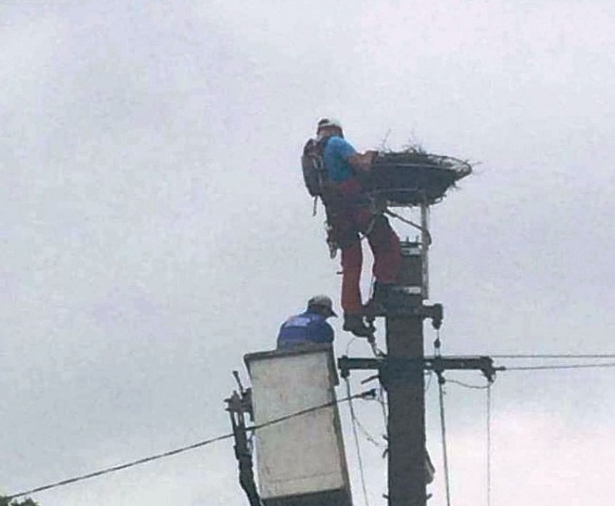 Un cuib de barză din comuna botosăneană Lunca a fost dărâmat de furtună, moment în care au intervenit angajaţi ai Delgaz.