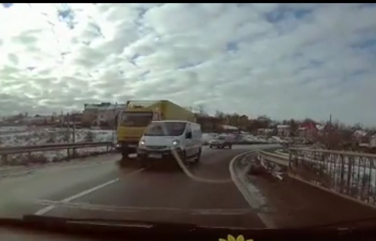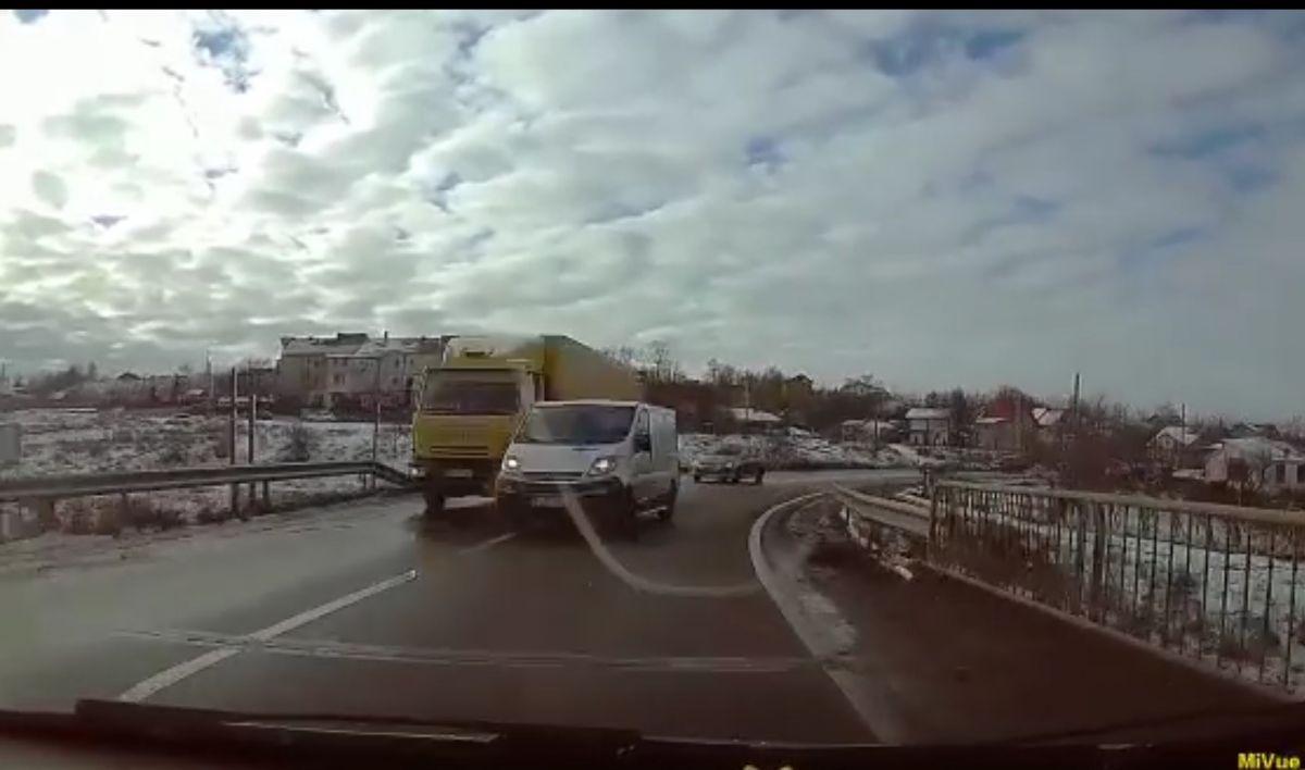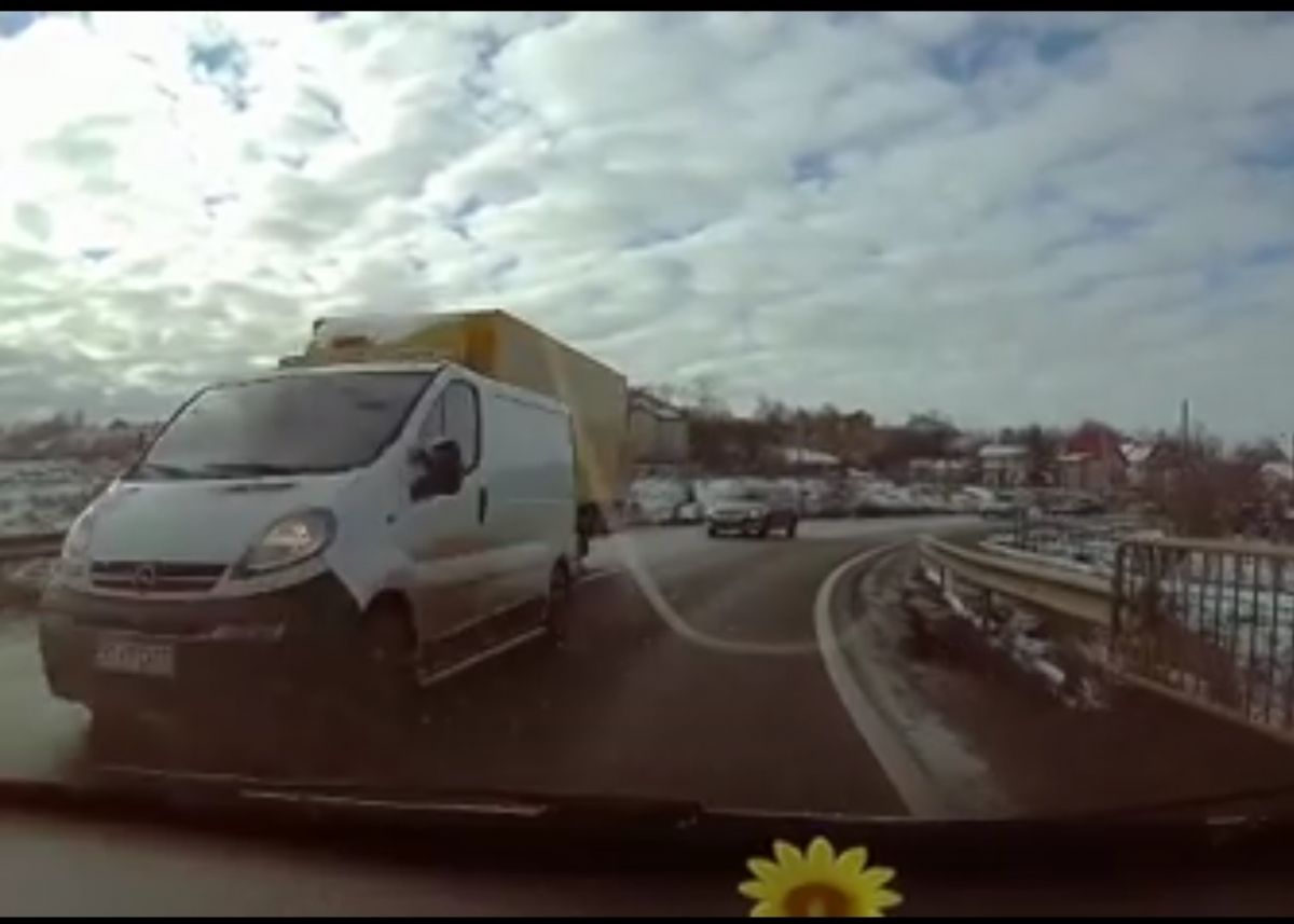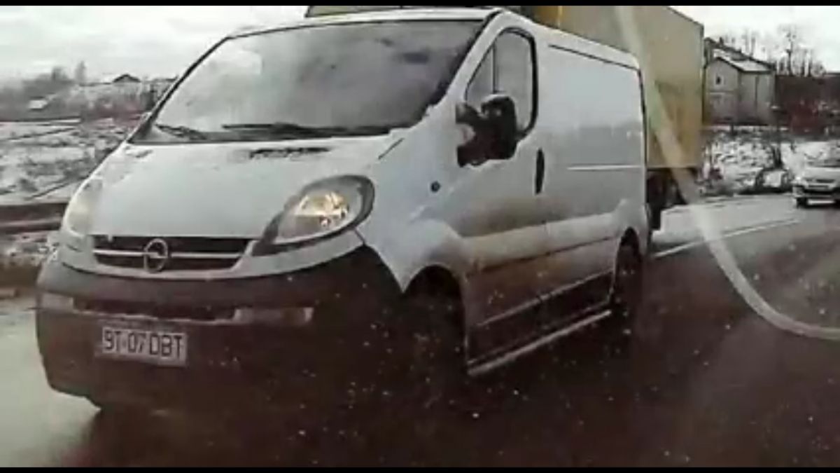În imagini se observă cum o autoutilitară cu număr de Botoșani se înscrie în depășirea unui camion. Acțiunea are loc în curbă, pe linie continuă, pe un pod, în condițiile în care din față venea o mașină.