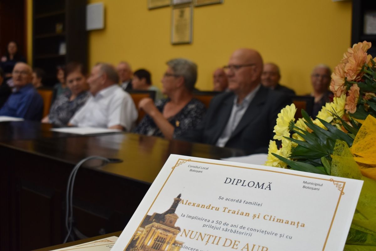Zâmbete, emoții, melancolie și din când în când câteva lacrimi, toate s-au putut vedea astăzi la Primăria Botoșani, acolo unde au fost premiate cuplurile care au împlinit 50 de ani de la căsătorie.