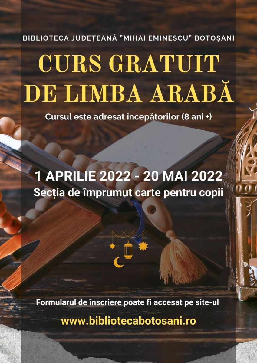 Biblioteca Județeană „Mihai Eminescu” Botoșani organizează în perioada 1 aprilie – 20 mai 2022 cursuri gratuite de limba arabă dedicate începătorilor.