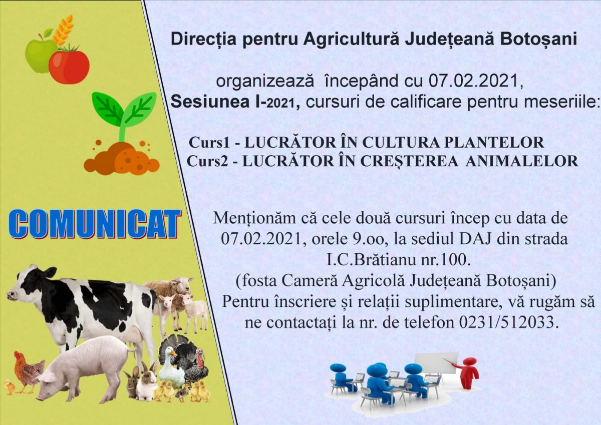 Direcția pentru Agricultură Județeană Botoșani organizează începând cu 7 februarie 2021, Sesiunea – I – 2021 a cursurilor de calificare în meserii din domeniu agricol.