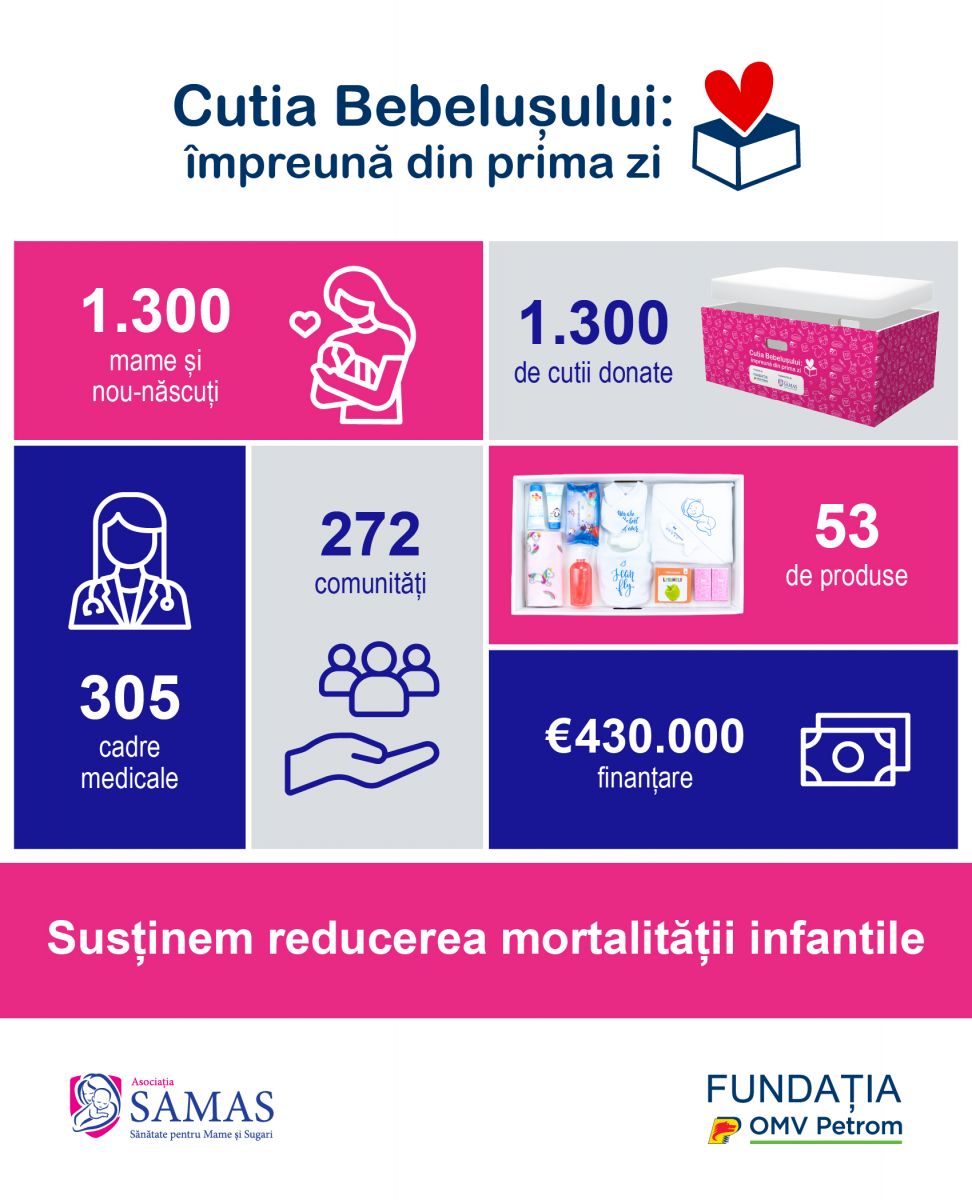 Asociaţia SAMAS, cu sprijinul Fundaţiei OMV Petrom, lansează programul Cutia Bebeluşului, dedicat mamelor și bebelușilor, cu scopul de a reduce mortalitatea infantilă şi de a sprijini familiile imediat după naştere.
