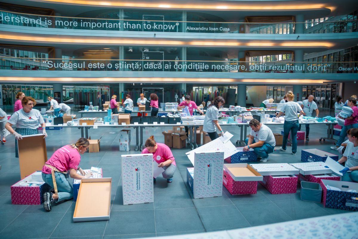 Primele 200 de cutii, asamblate și echipate cu ajutorul voluntarilor Fundației OMV Petrom, sunt pregătite pentru a fi expediate către mamele și bebelușii lor din comunitățile vulnerabile din primele 17 localități cuprinse în program.
