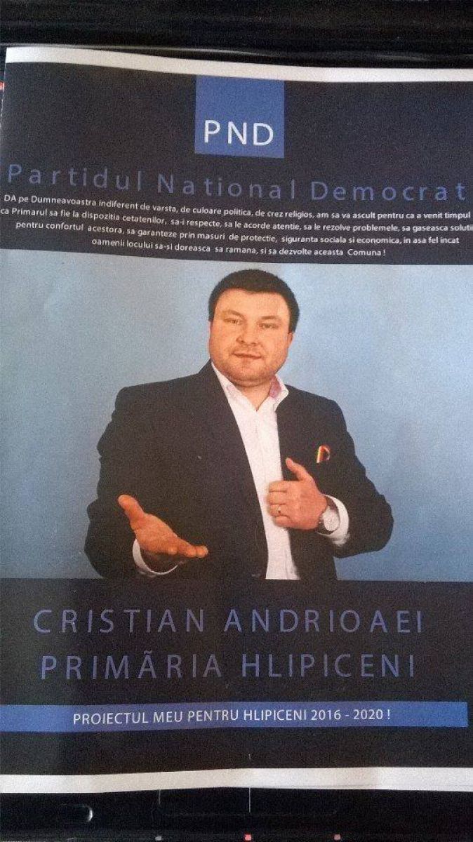 Al doilea este al candidatului, deja vedetă de la Hlipiceni, Cristian Andrioaei pe numele său, susținut de Partidul Național Democrat (PND), un crâmpei din ceea ce a fost partidul OTV-istului Diaconescu.