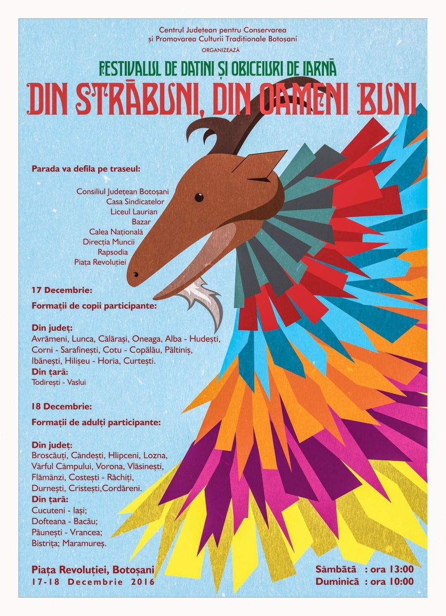 Sâmbătă, 17 decembrie 2016 ora 13.00, va începe manifestarea culturală cu spectacolele formațiilor de datini și obiceiuri de iarnă din județ, în Piața Revoluției, unde va fi amplasată scena. Vor prezenta spectacole formaţiile din judeţul Botoşani din localitățile: Avrămeni, Lunca, Călărași, Oneaga, Alba-Hudești, Sarafinești-Corni, Cotu-Copălău, Păltiniș, Ibănești, Hilișeu-Horia, Curteşti, Todireşti-Vaslui.