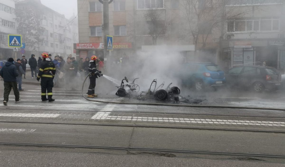 Mașina care a fost cuprinsă de flăcări pe strada Ion Pillat a ars în totalitate.