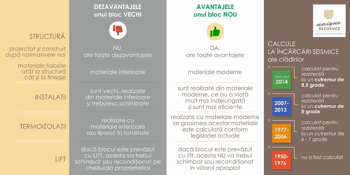 Pe de altă parte, este important să înțelegem că, pentru construcțiile noi normativele tehnice în vigoare sunt mult peste cele utilizate la realizarea celor vechi, iar soluțiile de proiectare, materialele structurale cât și cele folosite pentru izolare fonică, termică, hidrofugă, protecție la foc sunt actuale și fiecare dintre acestea respectă normele în vigoare.