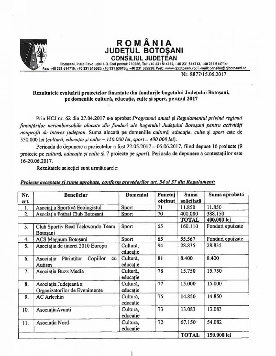 Comisia de evaluare a proiectelor depuse la Consiliul Judeţean Botoşani pentru domeniile cultură, educaţie, culte şi sport a anunţat rezultatele finale.