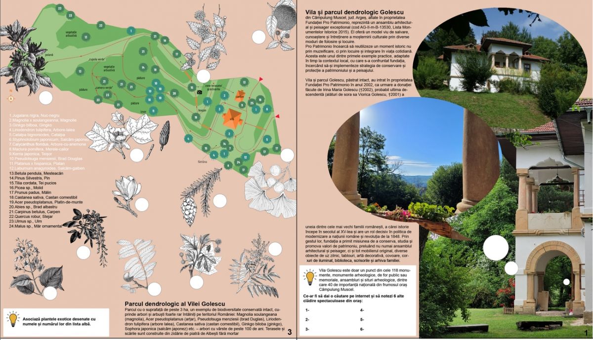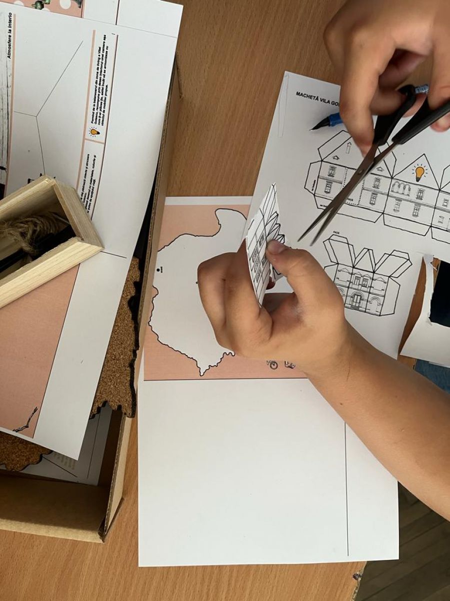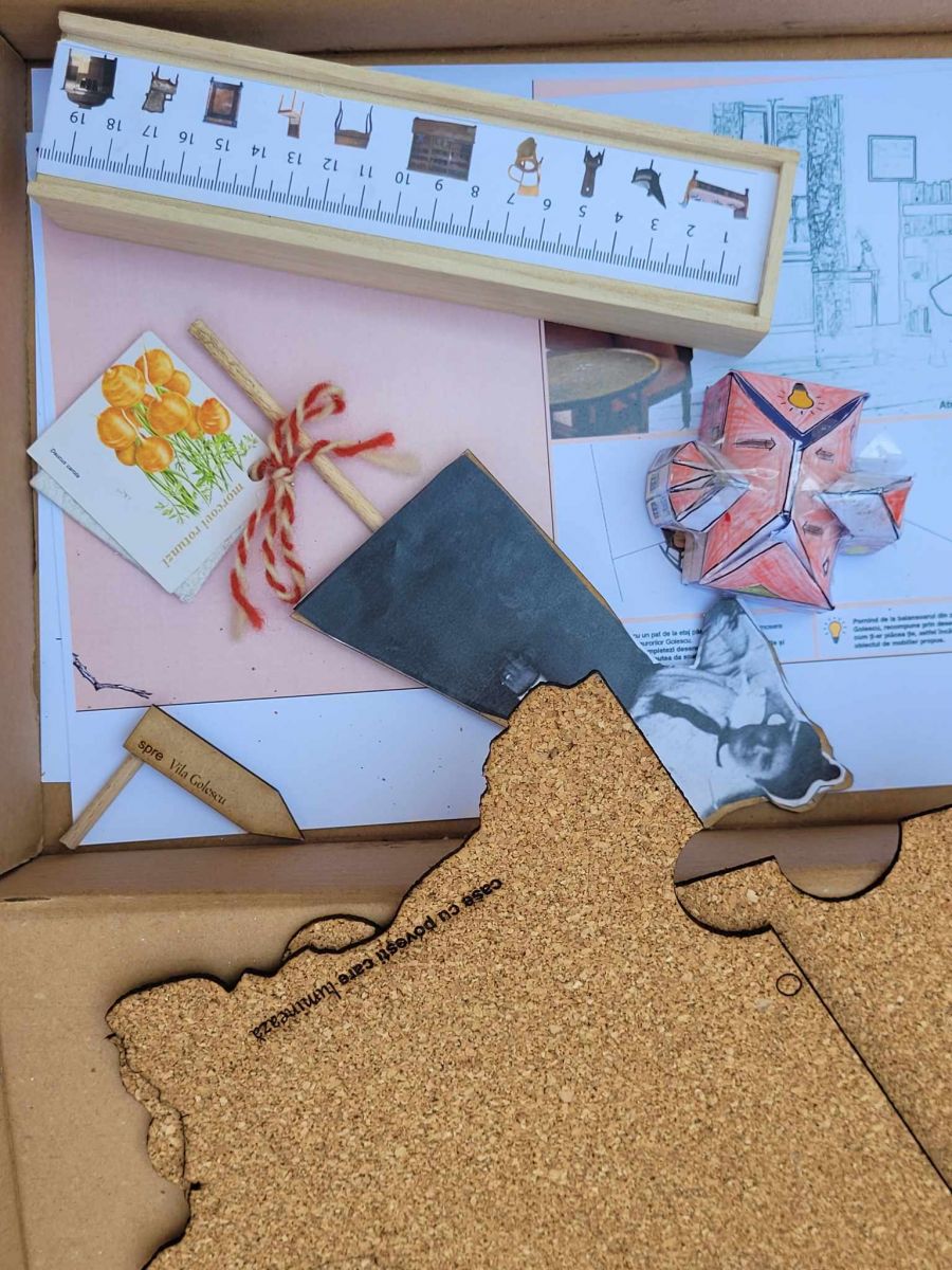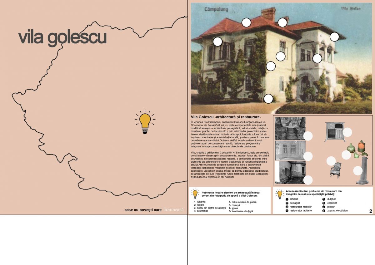 Din pachetul cu materiale de bricolaj primit, copiii au găsit macheta de hârtie a altui monument istoric de care Fundaţia Pro Patrimonio se ocupă, Vila Golescu de la Câmpulung Muscel, judeţul Argeş. Tot aici au găsit penare cu piese de mobilier, inserții personalizate pirogravate şi informaţii sistematizate despre Vila Golescu şi poveştile ei. Au putut asambla căsuţa luminoasă, au realizat etichetele doamnei Maria Cantili Golescu pentru viitoarea plantație de morcovi pitici precum și o rețetă de dulceață de la 1900. Cu această ocazie au aflat ce este un arbore genealogic şi de ce este el util şi au putut să creioneze propriul arbore urmând modelul familiei Vasile şi Maria Golescu. Restul setului l-au pregătit pentru explorări ulterioare acasă.