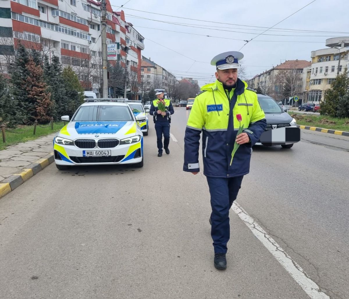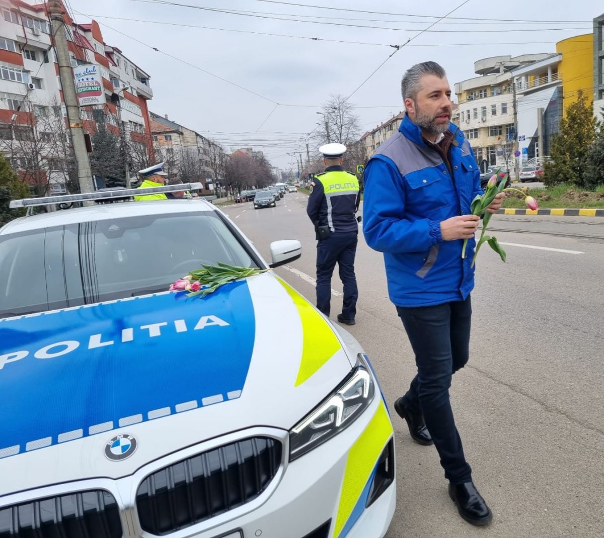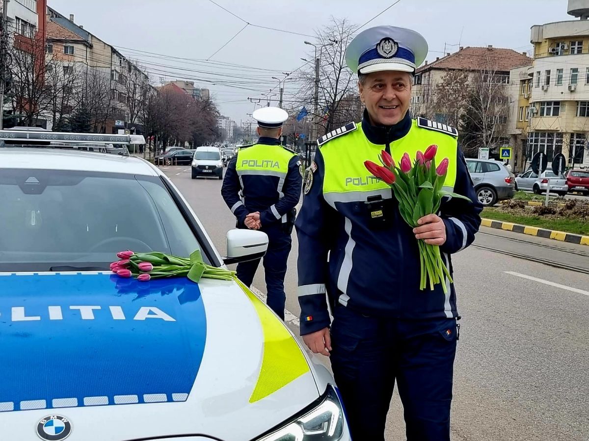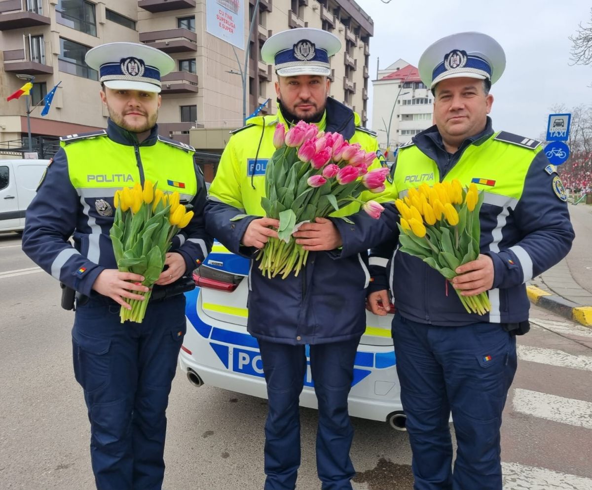 Și de 8 martie, doamnele și domnișoarele care s-au aflat în trafic au avut parte de o surpriză din partea polițiștilor rutieri și a reprezentanților Registrului Auto Român.