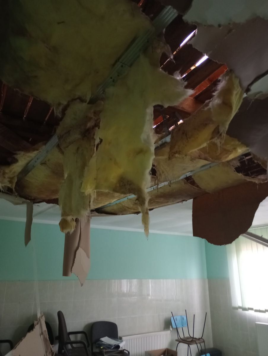 Potrivit edilului, acoperişul sediului Primăriei a fost smuls de vântul puternic, iar birourile de la etajul clădirii au fost inundate.