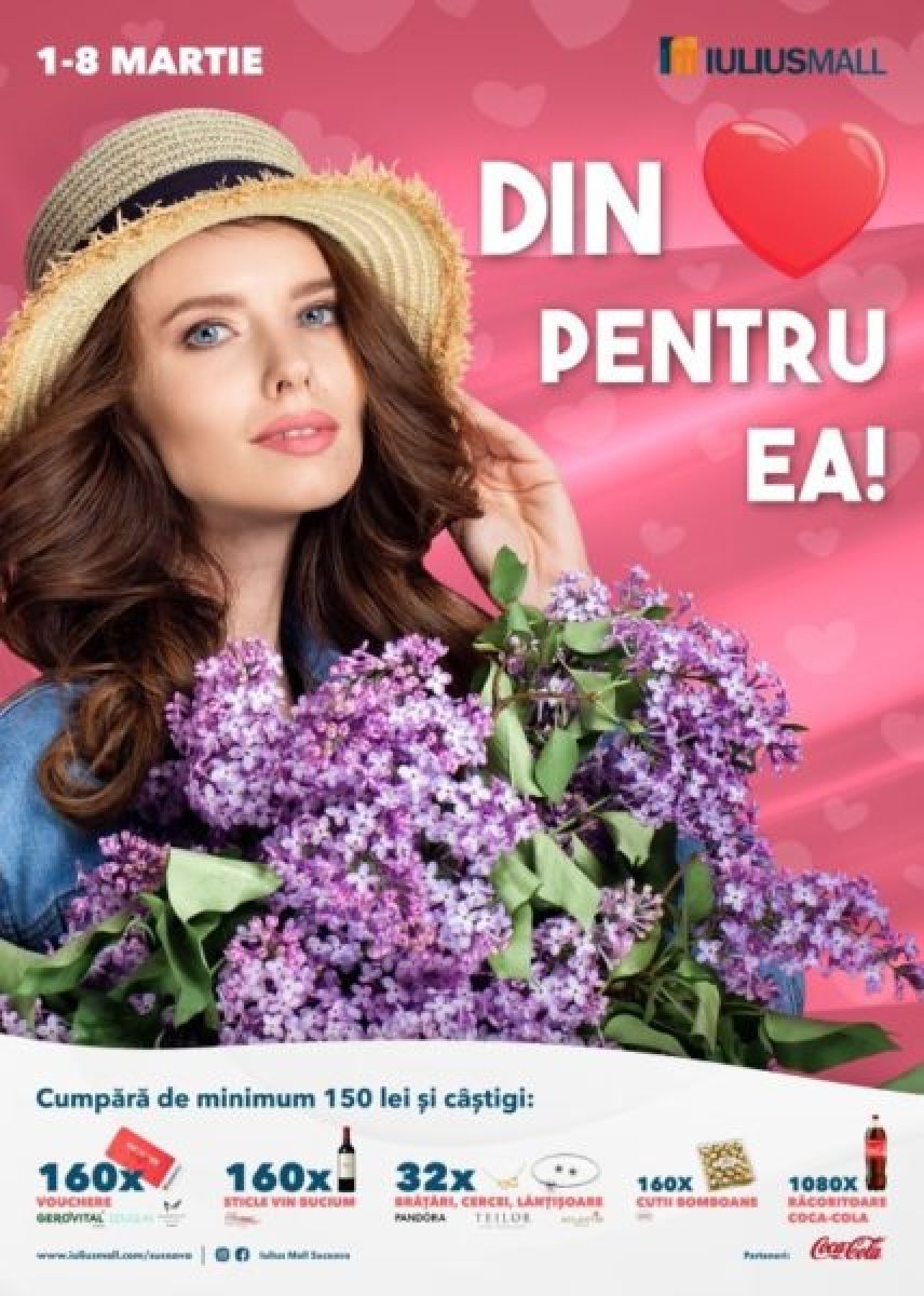 Ziua Internațională a Femeii este motiv de sărbătoare la Iulius Mall Suceava și prilej pentru a le complimenta pe doamne și domnișoare cu daruri. Astfel, în perioada 1 – 8 martie 2020 se desfășoară campania „Din dragoste pentru ea”. Toți clienții care cumpără în valoare de minimum 150 de lei din magazinele lor preferate se pot înscrie în campania cu premii adorate de femei. Tot ce trebuie să facă este să se bucure de shopping și să meargă cu bonurile fiscale la Centrul Info.