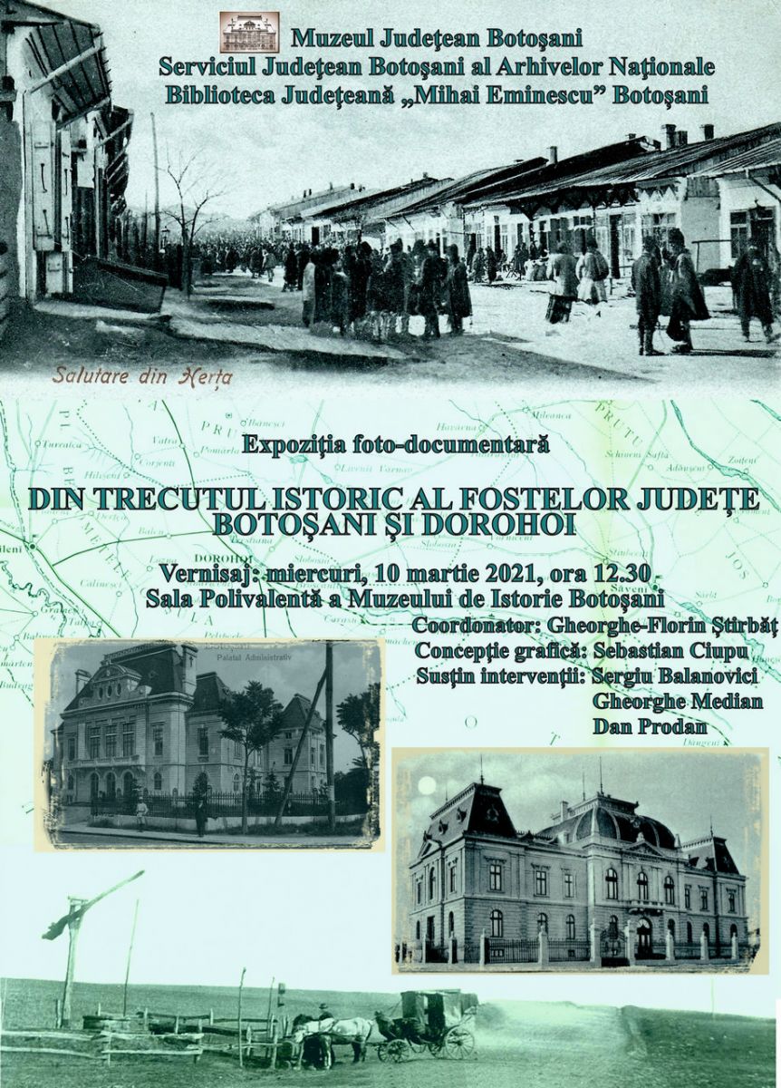 Muzeul Judeţean Botoșani, în colaborare cu Serviciul Județean Botoșani al Arhivelor Naționale și Biblioteca Județeană „Mihai Eminescu” Botoșani, vă invită miercuri, 10 martie 2021, ora 12.30, la vernisajul expoziţiei foto-documentare „Din trecutul istoric al fostelor județe Botoșani și Dorohoi”.