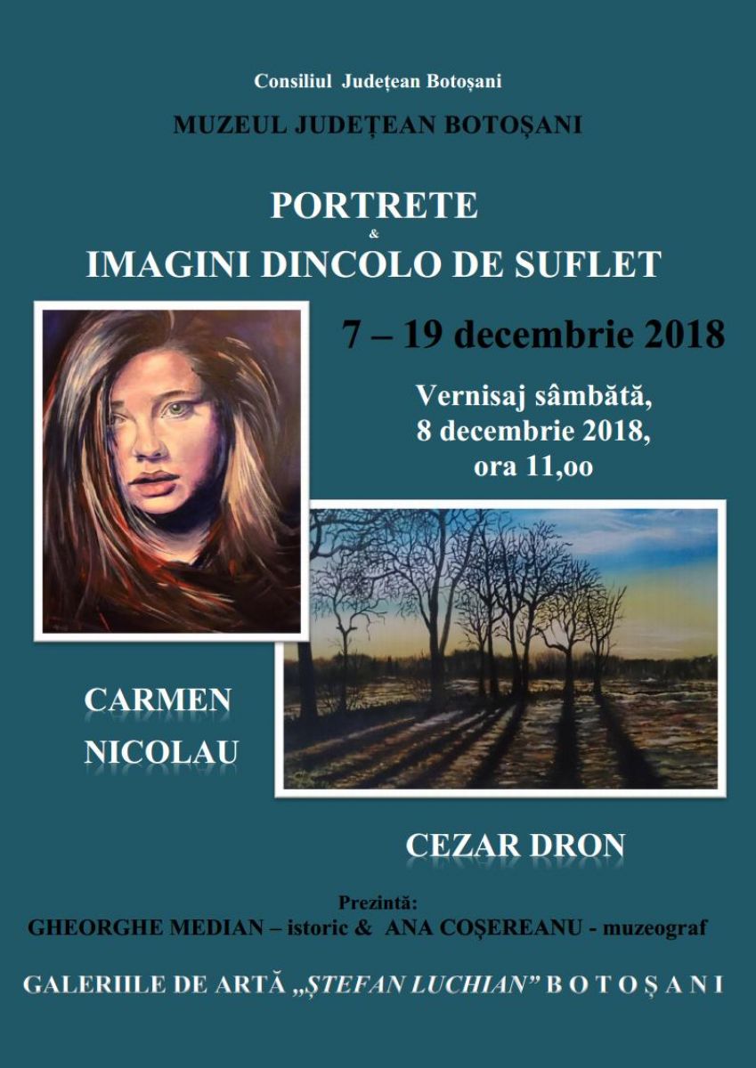Muzeul Judeţean Botoşani prezintă în perioada 7 – 19 decembrie 2018, în spațiul Galeriilor de Artă ,,Ștefan Luchianˮ expoziţia ,,Portrete & imagini de dincolo de suflet”, cuprinzând lucrări de pictură semnate de Carmen Nicolau și Cezar Dron.