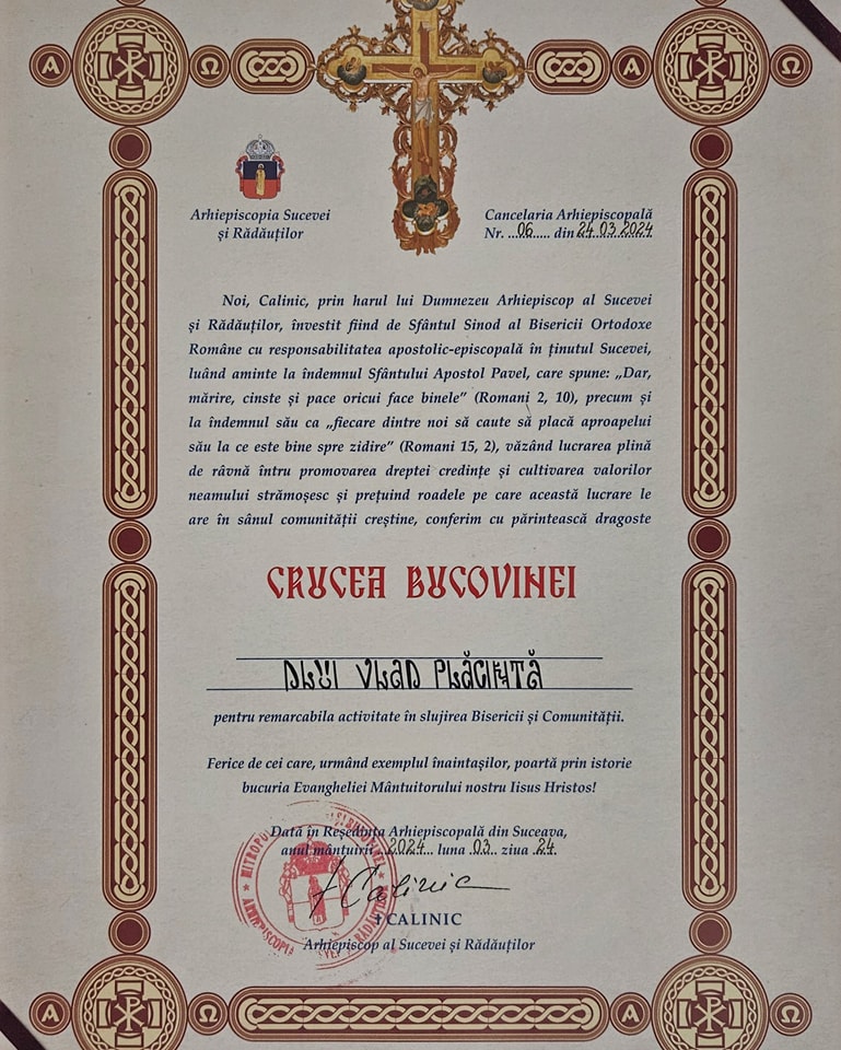„În inima Bucovinei, unde credința și tradiția se împletesc într-un dans etern, am avut onoarea de a primi astăzi, prin mila nesfârșită a lui Dumnezeu, un dar nemăsurat. IPS Calinic, Arhiepiscopul Sucevei și Rădăuților, mi-a conferit ordinul "Crucea Bucovinei", o distincție ce mă umple de o recunoștință adâncă și de o responsabilitate pe măsură.
