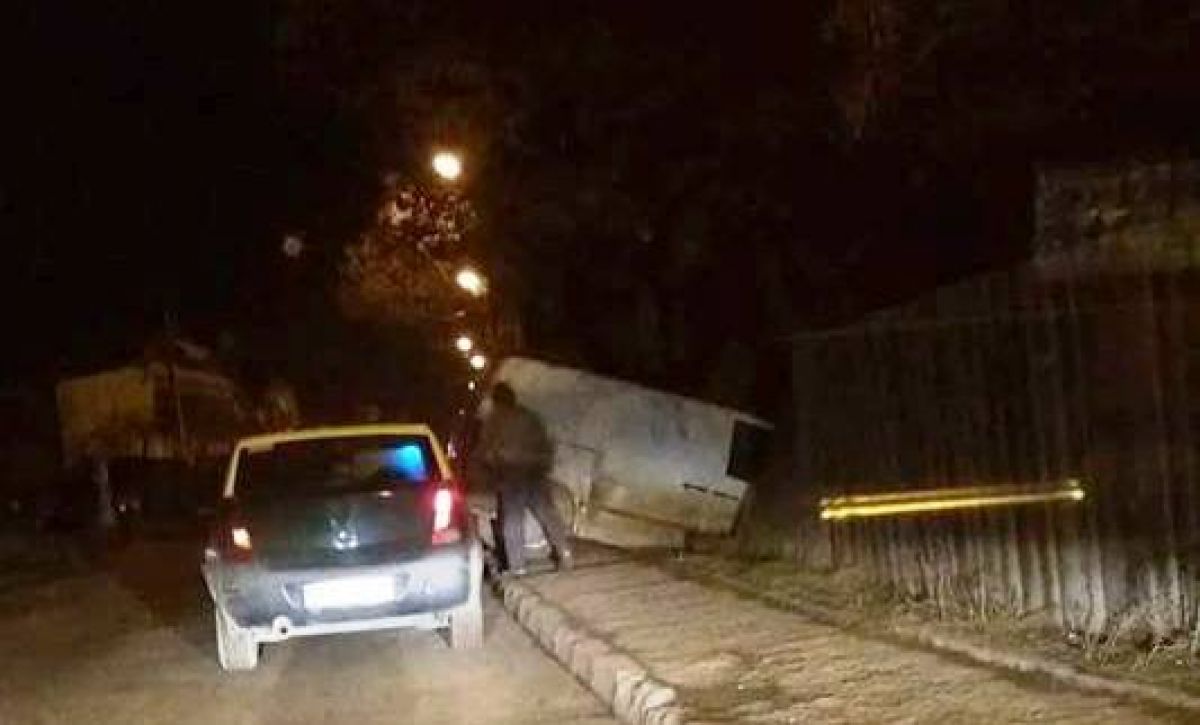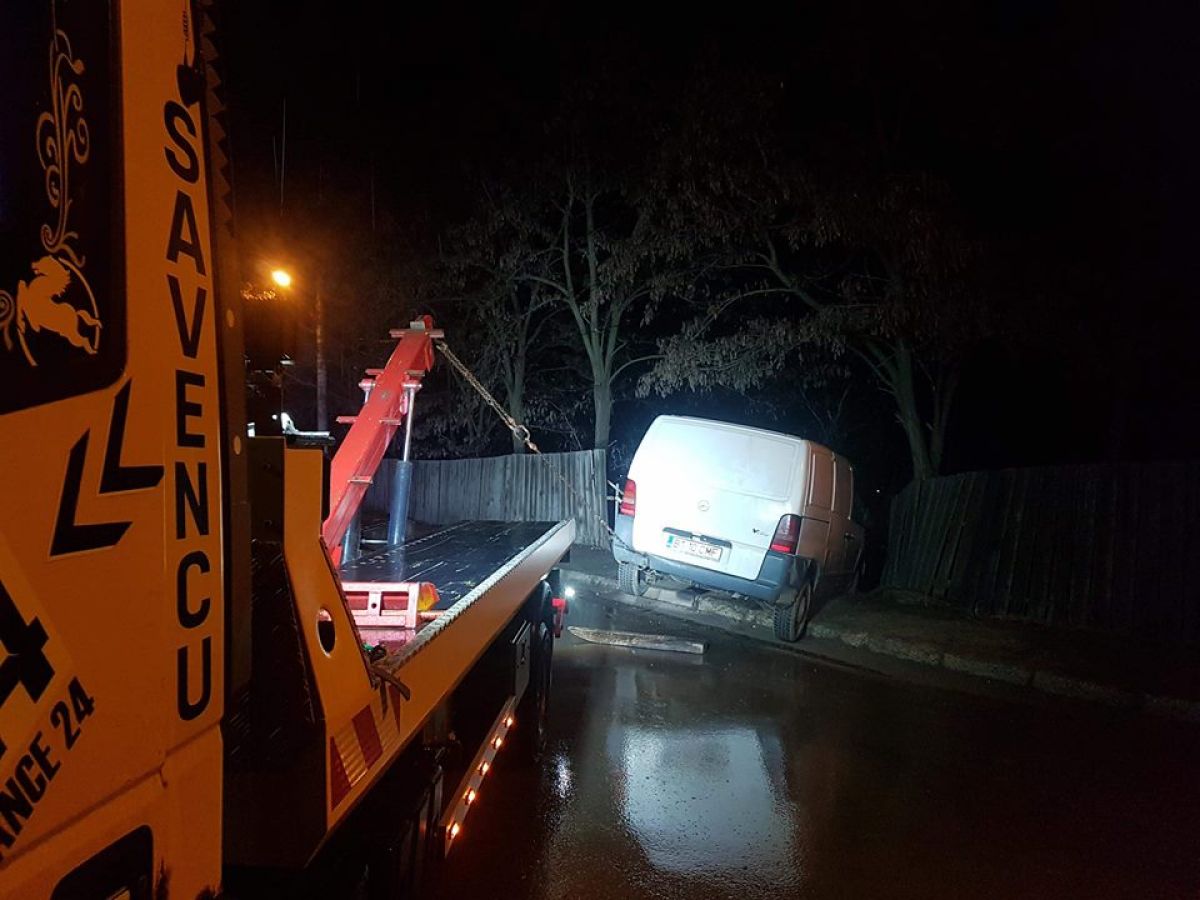 Și nu cu orice automobil ci cu un Mercedes Vito care din motive deocamdată neelucidate a sărit de pe șosea și a intrat aproape perpendicular într-un gard pe care l-a făcut praf.