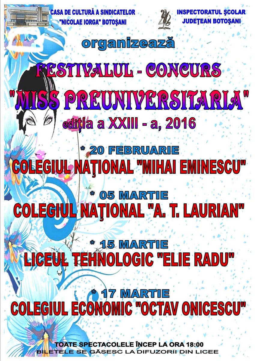 Unul dintre puținele licee botoșănene înscrise la festivalul – concurs de Miss Preuniversitaria 2016, ediția a XXIII-a, a ieșit din cursa frumuseții.