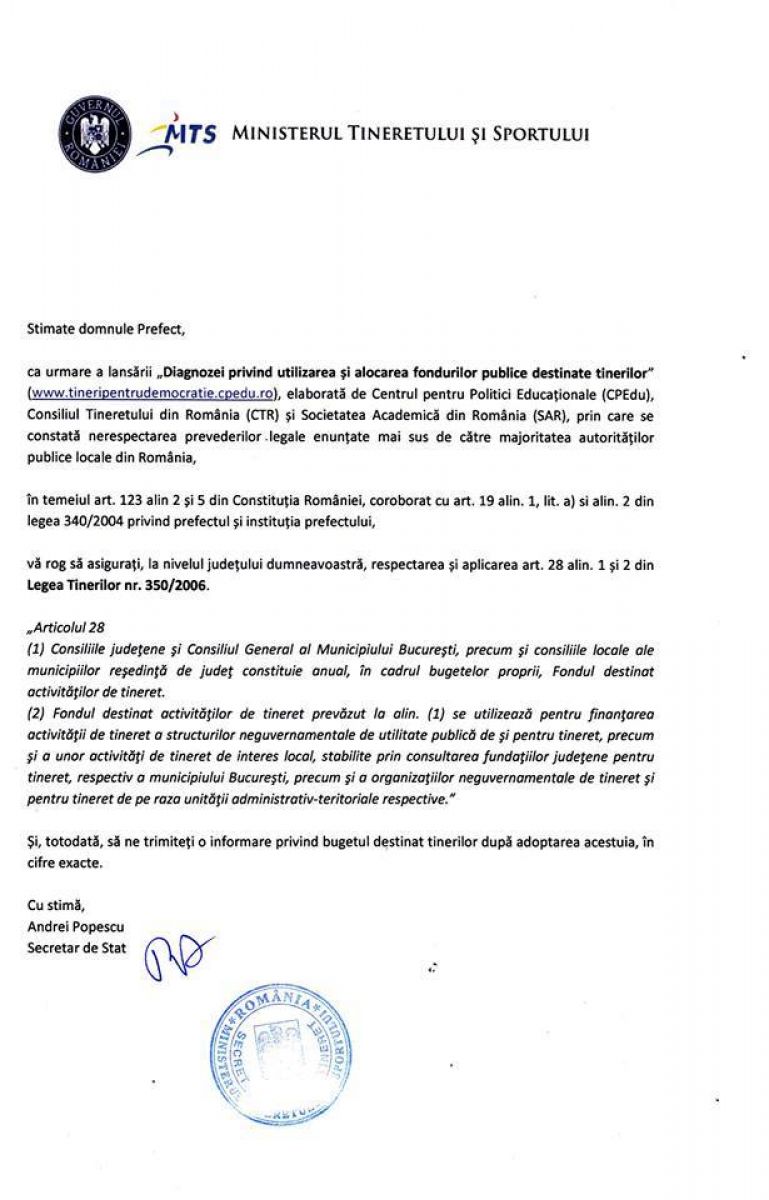MTS a trimis amintita adresă după ce ”Diagnoza privind utilizarea și alocarea fondurilor publice destinate tinerilor” a relevat faptul că majoritatea autorităților publice din România nu respectă prevederile legale privind constituirea fondurilor pentru tineret.