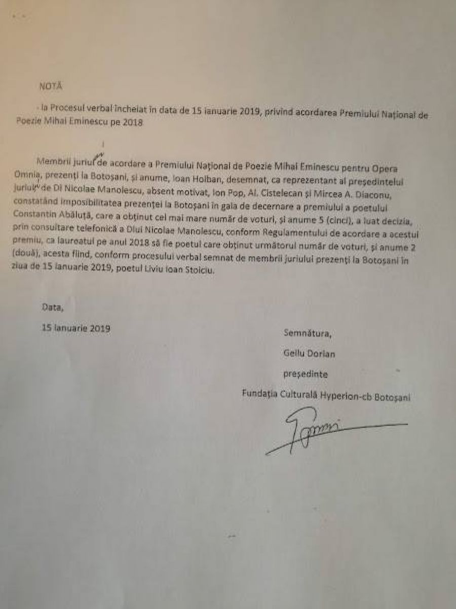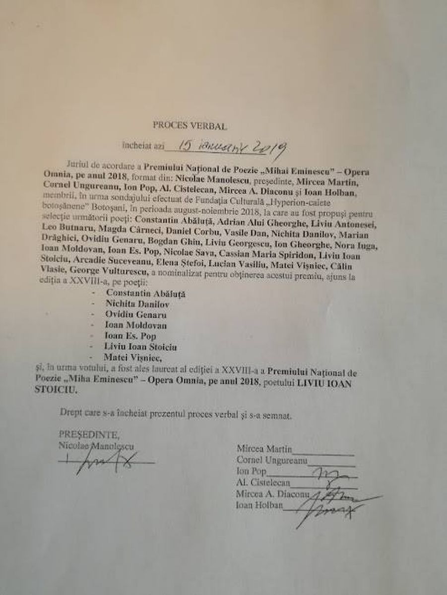 Acum mai știm că procesul verbal prin care premiul trece către al doilea clasat nu este semnat de doi dintre membrii juriului, respectiv Mircea Martin și Cornel Ungureanu.