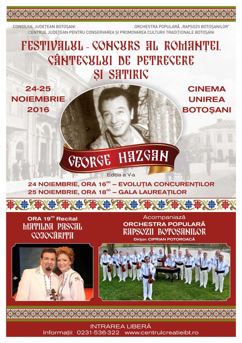 Centrul Judeţean pentru Conservarea şi Promovarea Culturii Tradiţionale Botoşani în parteneriat cu Orchestra Populară “Rapsozii Botoşanilor”, instituţii de cultură aflate în subordinea Consiliului Judeţean Botoşani, organizează Festivalul-concurs „George Hazgan” al romanţei, cântecului de petrecere şi satiric, ediţia a V-a, în perioada 24-25 noiembrie 2016, se arată într-un comunicat de presă venit pe adresa redacției.