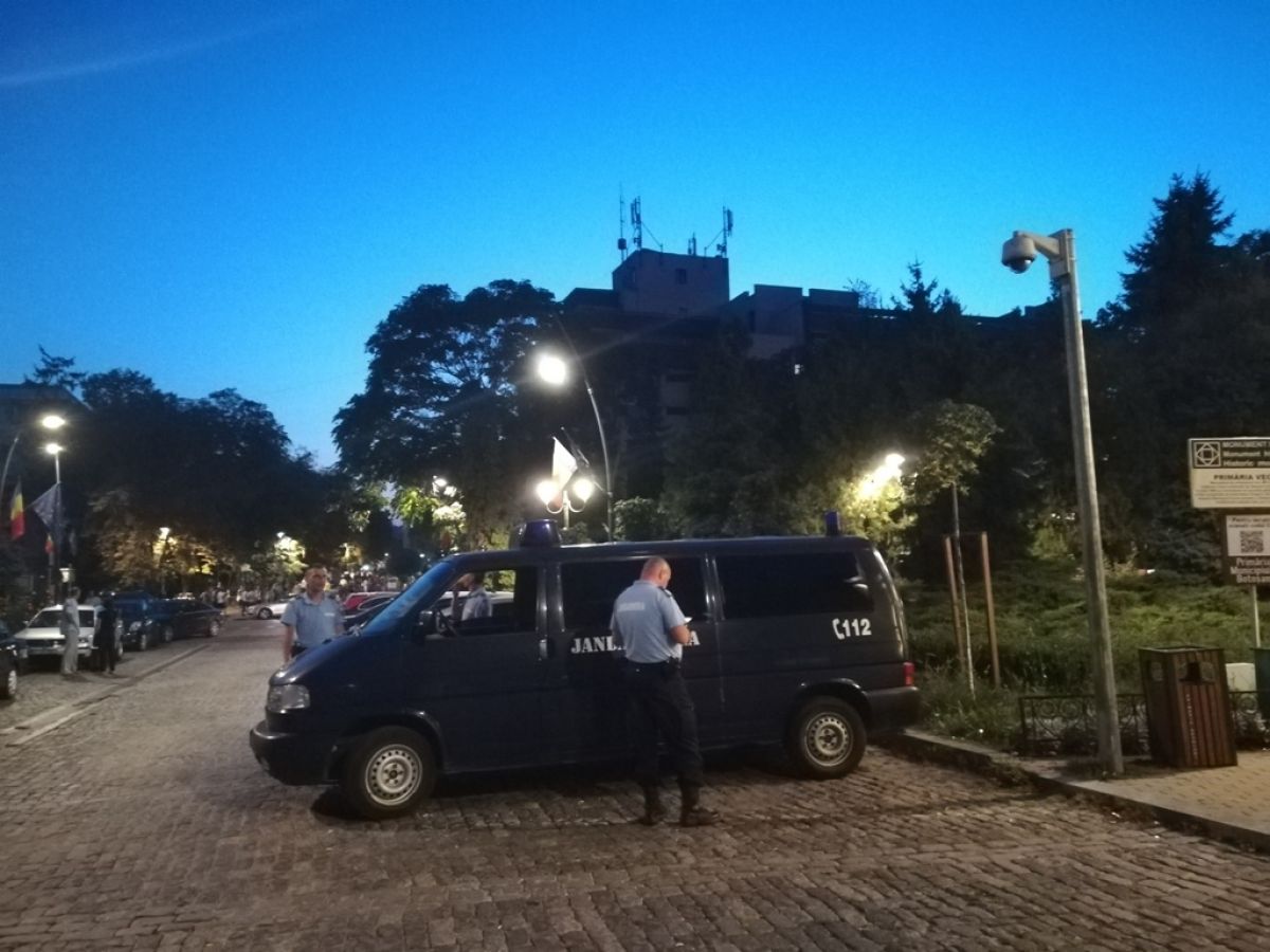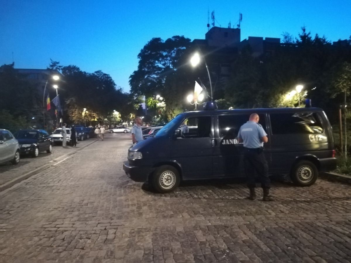 Inspectoratul de la Botoşani a trimis o dubă la doar câţiva metri de cei doi botoşăneni cu un efectiv de jandarmi cel puţin triplu peste cel al manifestanţilor.
