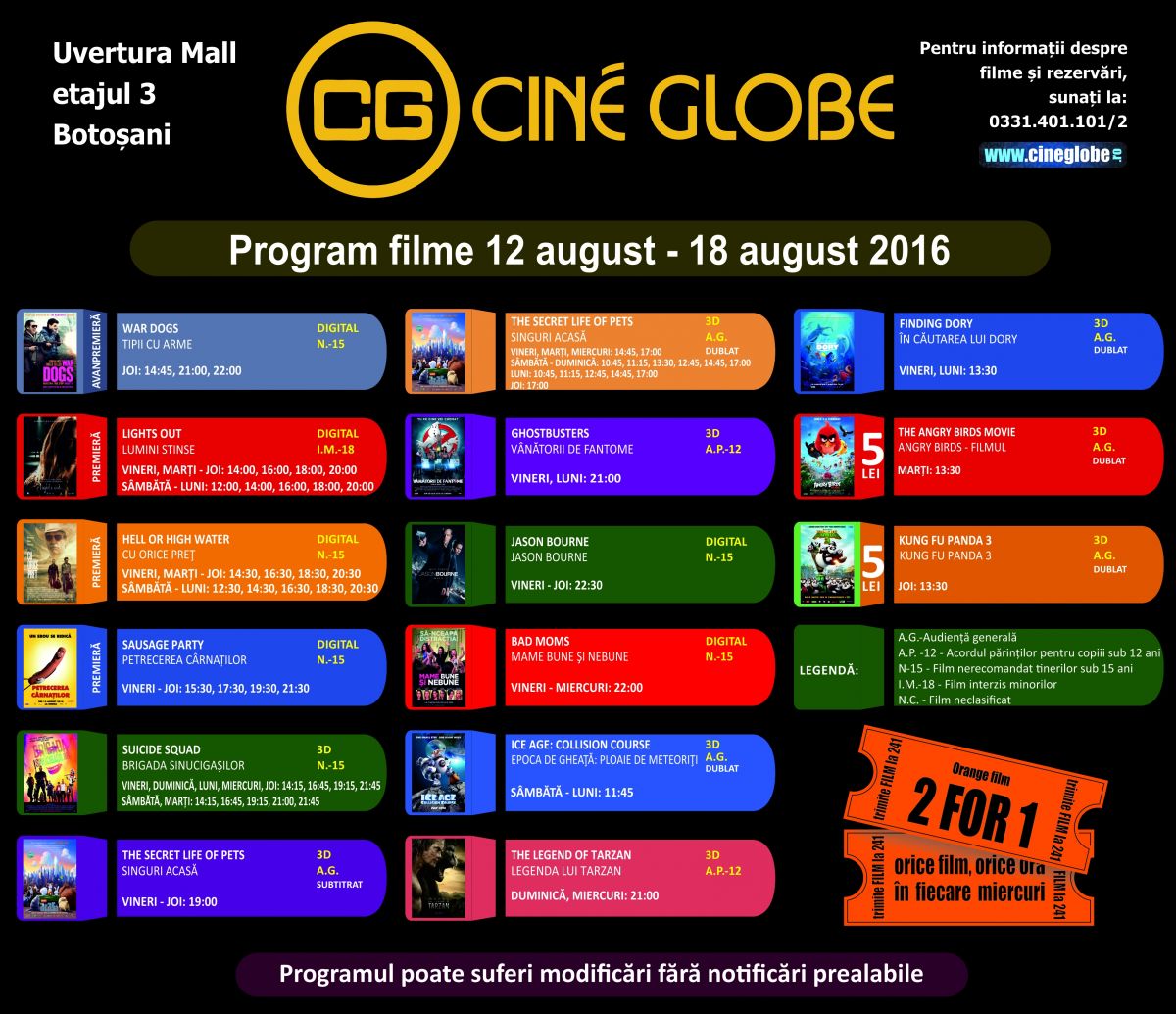 O avanpremieră și trei premiere vor rula pe marile ecrane ale multiplexului din incinta Uvertura Mall în perioada 12 -18 august 2016. Botoșănenii au ocazia să urmărească o comedie spumoasă și câteva filme pline de acțiune și suspans.