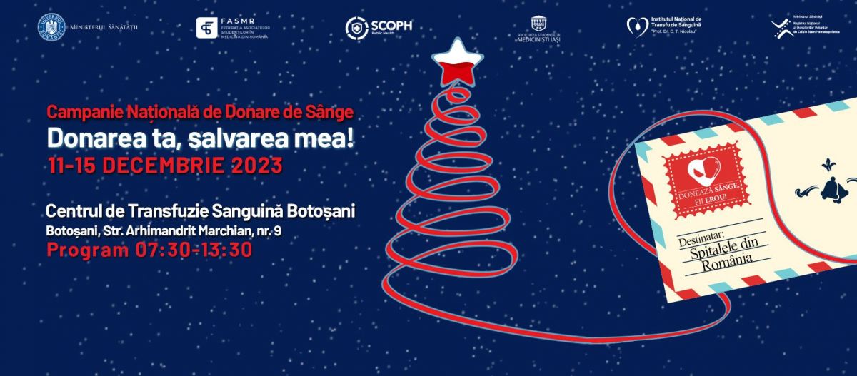 În perioada 11 - 15 decembrie va avea loc și la Botoșani, Campania Națională ”Donarea ta, salvarea mea” care se va desfăşura la Centrul de Transfuzie Sanguină din Botoșani.
