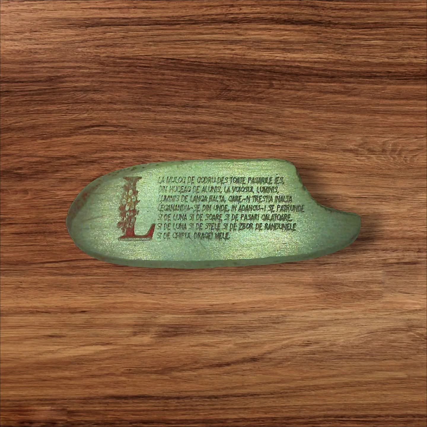 Cu o precizie aproape robotică, întreaga poezie „La mijloc de codru...” a fost gravată, pe șapte rânduri, pe doar 4 mm (4mm X 1,5mm), fiecare literă având aproximativ 150 de microni și grosimea unui fir de păr.