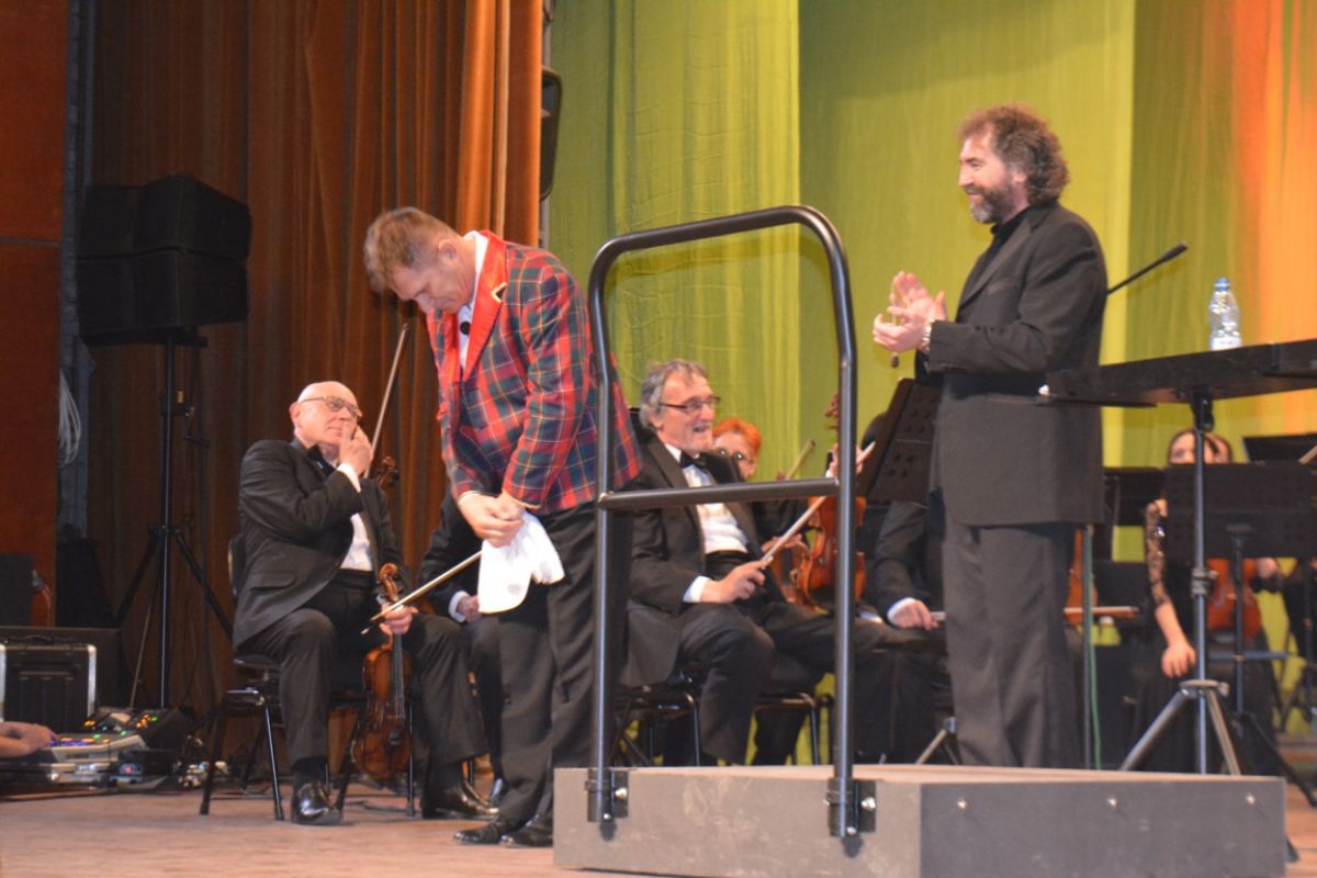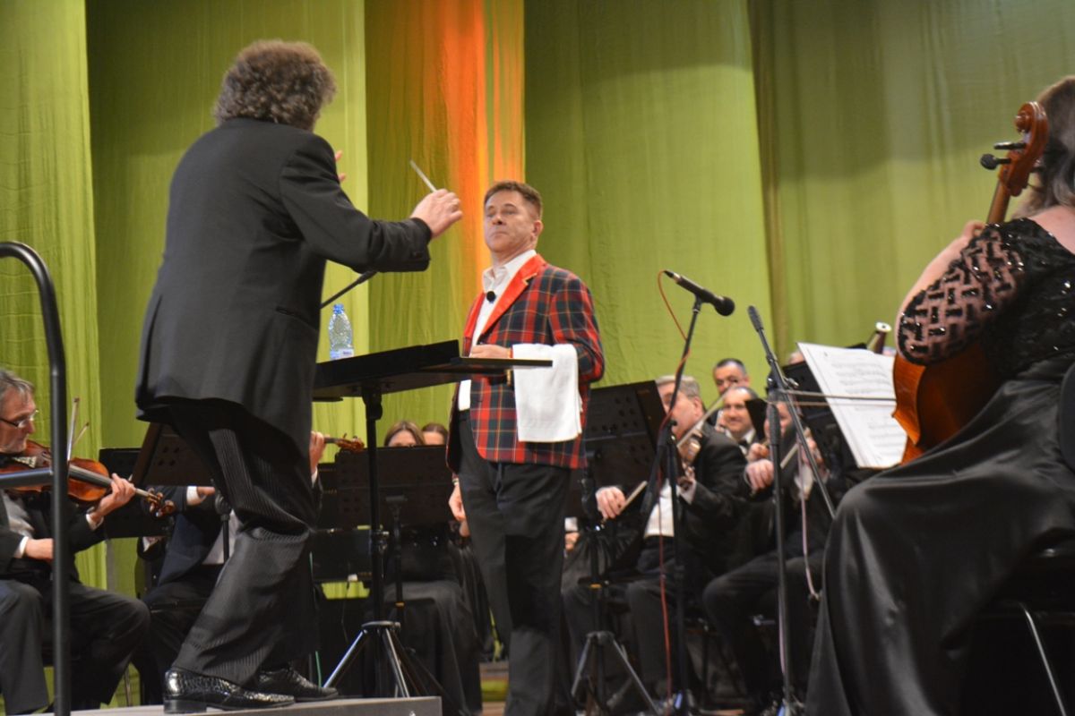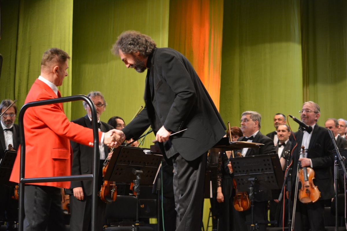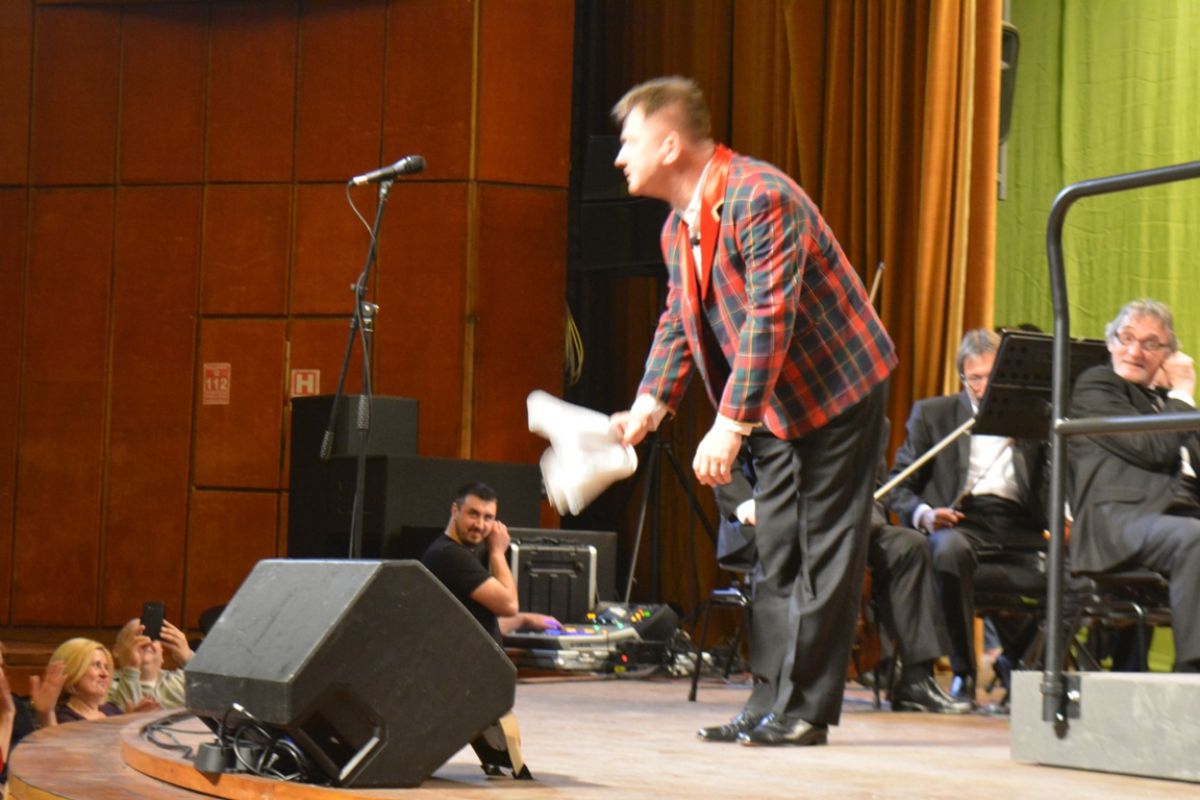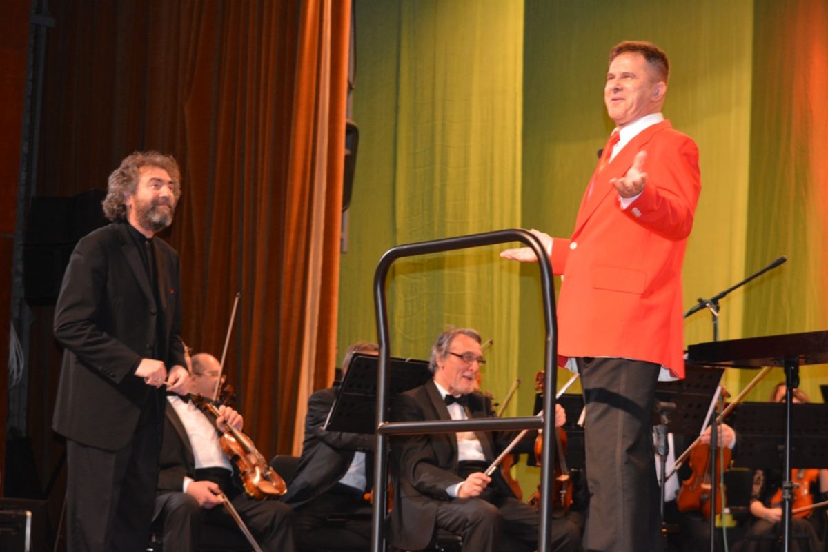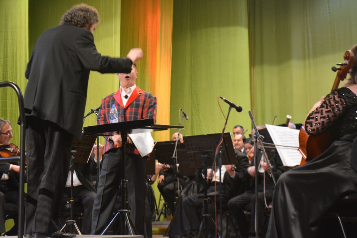 Și s-ar fi desfășurat fără probleme pe aceleași coordonate dacă pe scenă nu și-ar fi făcut apariția cunoscutul comediant. Acesta a anunțat pe cei 600 de spectatori care au umplut Casa de Cultură a Sindicatelor că tocmai a cumpărat Orchestra Simfonică de la Botoșani. Ca atare, deranjat de coafura în stil afro a dirijorului Iulian Rusu și de faptul că, ”de câte ori dau mâna cu el rămân cu păr în gură”, l-a trimis la frizer și s-a apucat el de dat indicații, de făcut glume și chiar de cântat cu un prosop într-o mână și cu o sticlă de apă în cealaltă, pentru ca spre final să ajungă inclusiv să dirijeze el orchestra. A avut mai multe intrări și ieșiri care au provocat hohote de râs și aplauze furtunoase atât pe scenă, printre muzicieni, cât mai ales în public.
