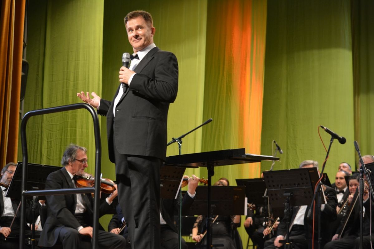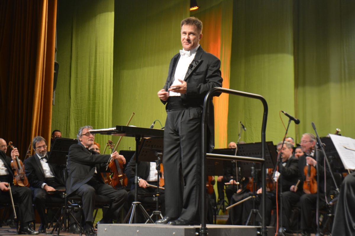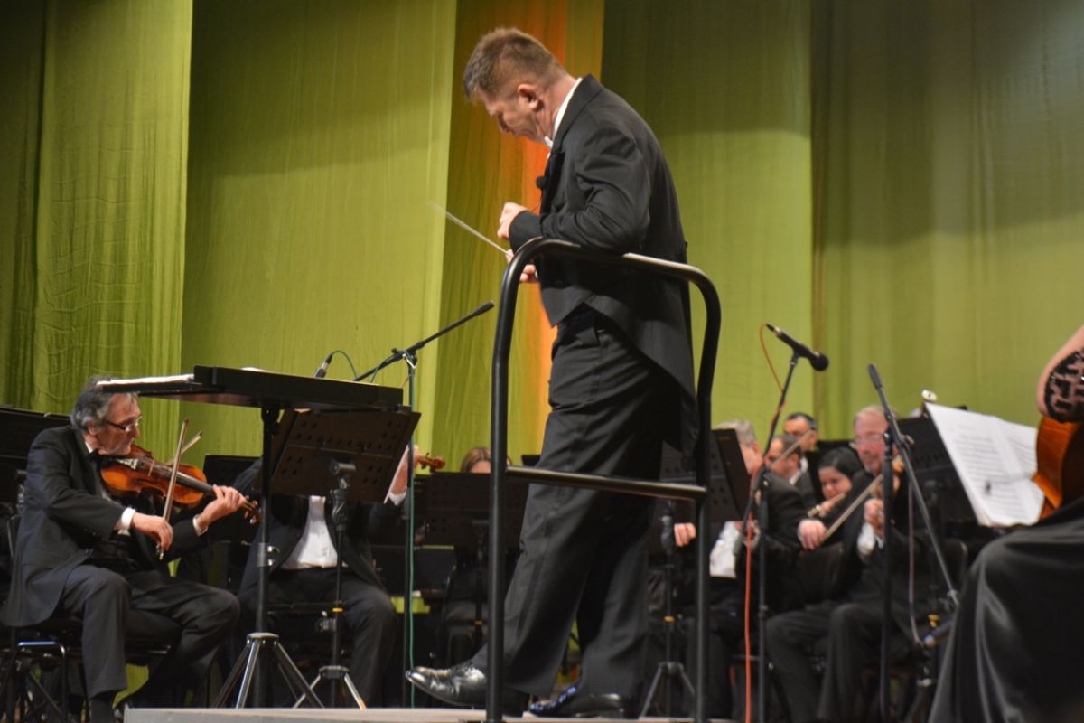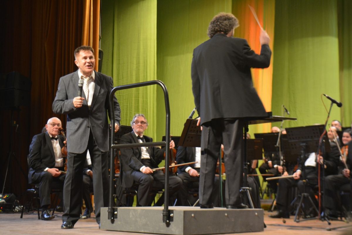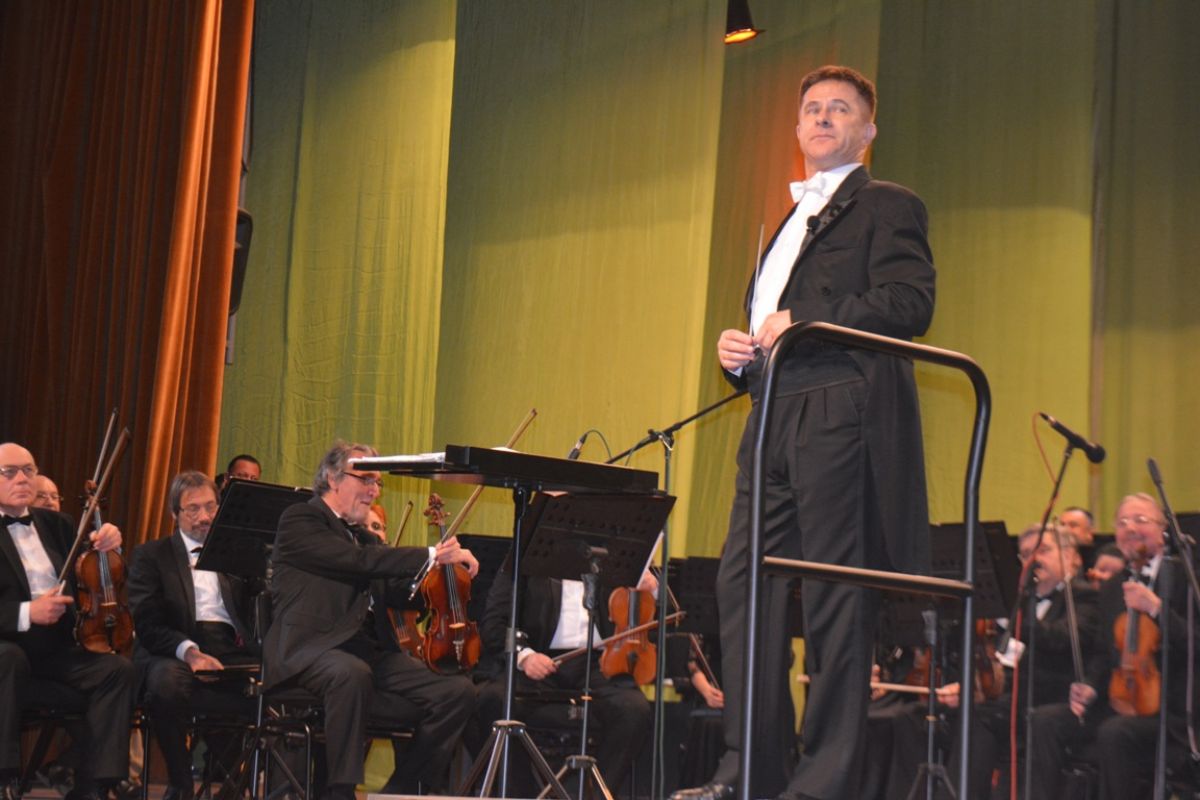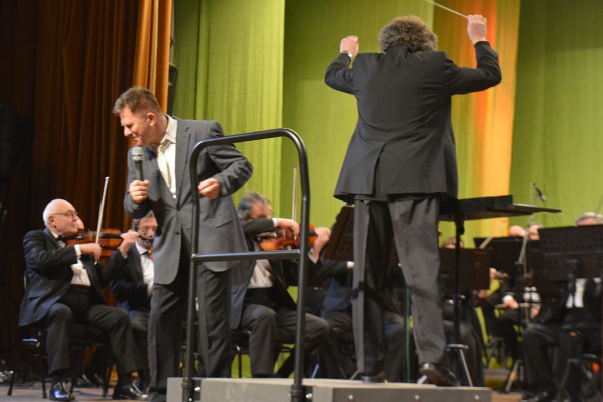 Și s-ar fi desfășurat fără probleme pe aceleași coordonate dacă pe scenă nu și-ar fi făcut apariția cunoscutul comediant. Acesta a anunțat pe cei 600 de spectatori care au umplut Casa de Cultură a Sindicatelor că tocmai a cumpărat Orchestra Simfonică de la Botoșani. Ca atare, deranjat de coafura în stil afro a dirijorului Iulian Rusu și de faptul că, ”de câte ori dau mâna cu el rămân cu păr în gură”, l-a trimis la frizer și s-a apucat el de dat indicații, de făcut glume și chiar de cântat cu un prosop într-o mână și cu o sticlă de apă în cealaltă, pentru ca spre final să ajungă inclusiv să dirijeze el orchestra. A avut mai multe intrări și ieșiri care au provocat hohote de râs și aplauze furtunoase atât pe scenă, printre muzicieni, cât mai ales în public.