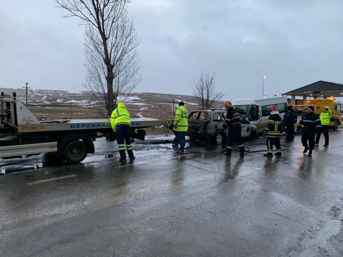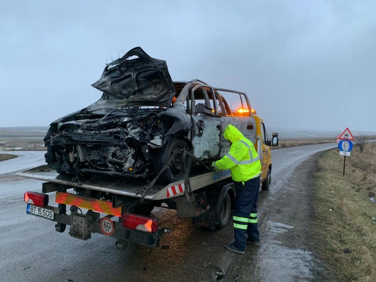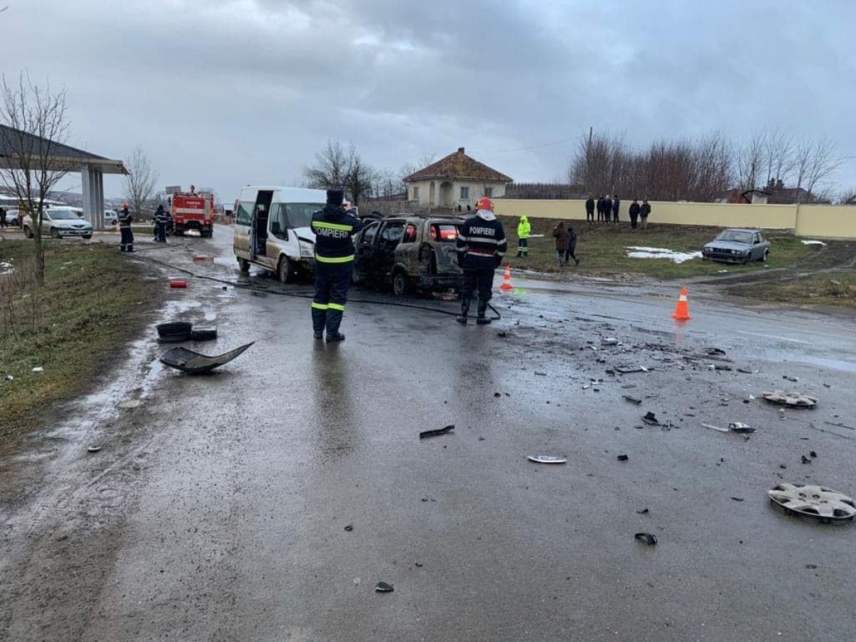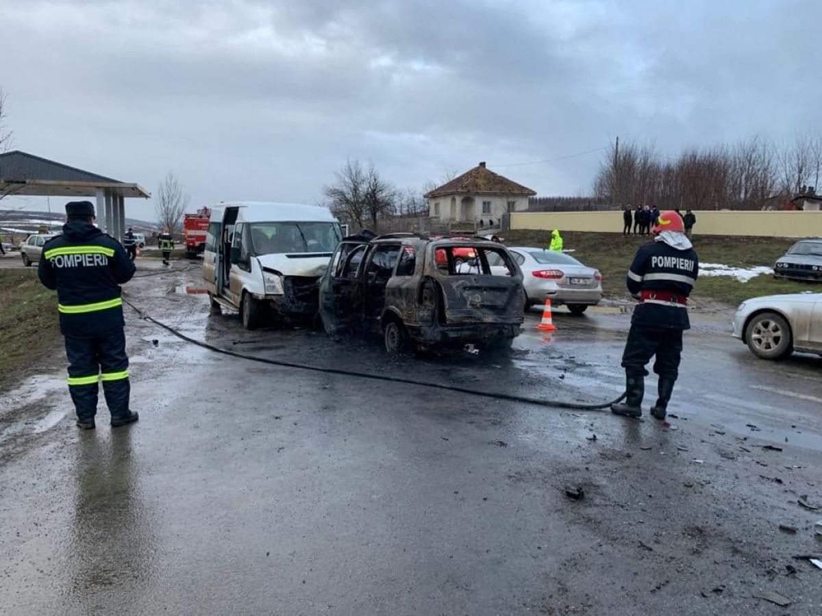 In urma impactului, autoturismul a fost cuprins de incendiu, care a fost lichidat de pompieri.